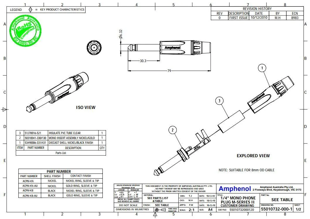 AMPHENOL ACPM-KB - джек моно, кабельный, 6.3 мм, корпус металл, цвет - черный