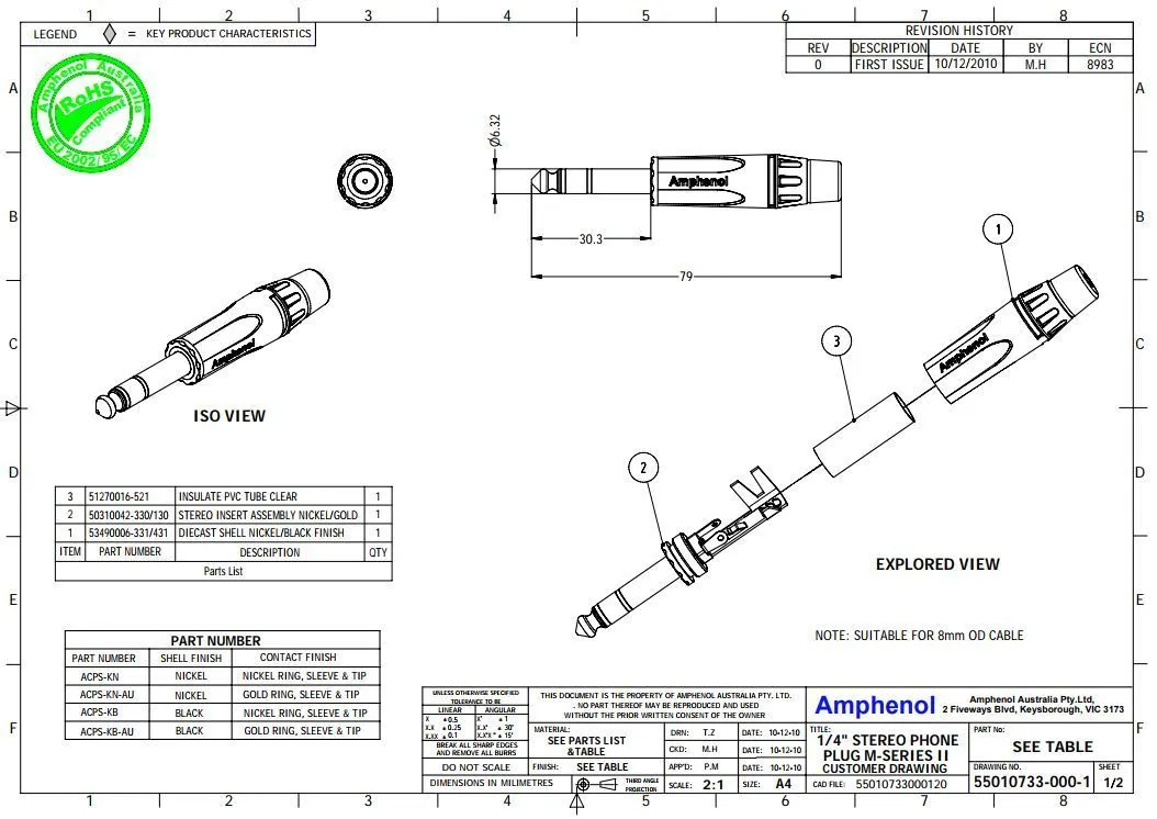 AMPHENOL ACPS-KB - джек стерео, кабельный, 6.3 мм, корпус металл, цвет - черный