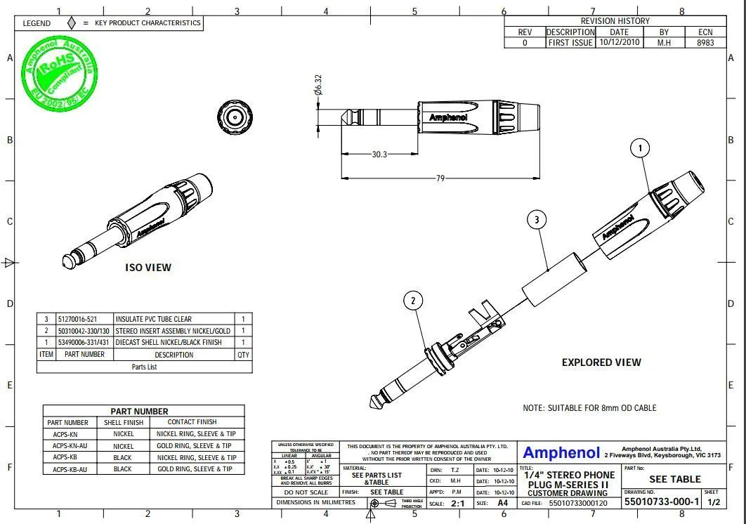 AMPHENOL ACPS-KN - джек стерео, кабельный, 6.3 мм, корпус металл, цвет - никель
