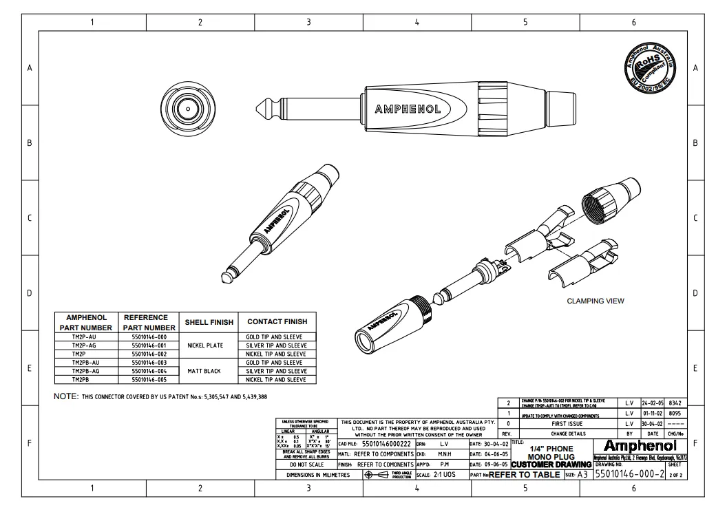 AMPHENOL TM2P - джек моно, кабельный, 6.3 мм, цвет никель, колпачок из термопластика