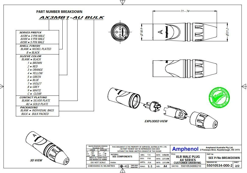 AMPHENOL AX3M - разъем XLR кабельный папа , 3 контакта ,точеные контакты, цвет - никель