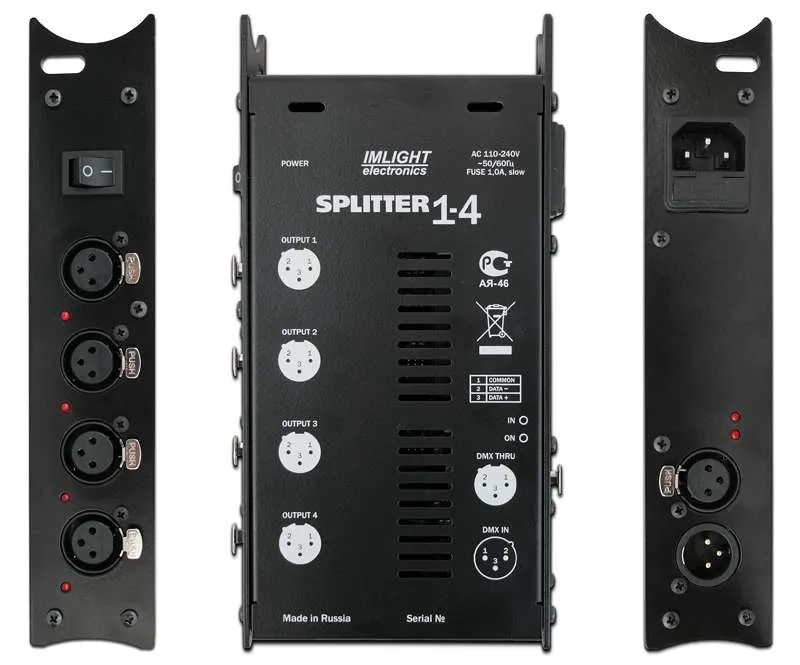 ИМЛАЙТ SPLITTER 1-4 Блок усиления сигнала DMX-512-А, 1 вход, 4 выхода с гальванической развязкой, встроенный терминатор, индикация по входу и выходу, питание от сети 100-240В 50/60Гц, разъемы XLP 3-pin, высота 1U, монтаж на ферму, стену, комплект настенно