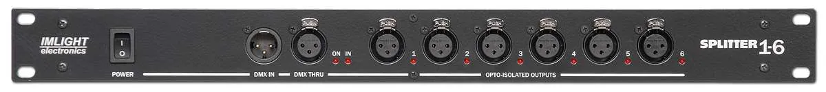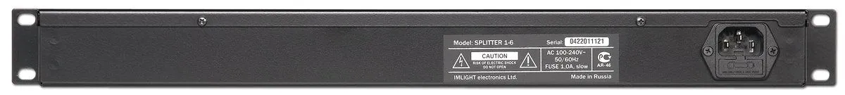 ИМЛАЙТ SPLITTER 1-6 Блок усиления сигнала DMX-512-А, 1 вход, 6 выходов с гальванической развязкой, встроенный терминатор 120 Ом, индикация по входу и выходу, питание от сети 100-240В 50/60Гц, разъемы XLP 3-pin, исполнение корпуса рэковое 1U
