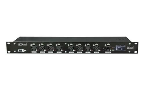 ИМЛАЙТ NETline-8 (OLED) Блок преобразования сигнала ARTNET в DMX-512-A, поддержка RDM, 1 вход, 8 выходов с гальванической развязкой, индикация по входу и выходам, питание по сети 110-240В 50/60Гц, разъемы EtherCon и XLR 3-pin роз., OLED индикатор,высота 1