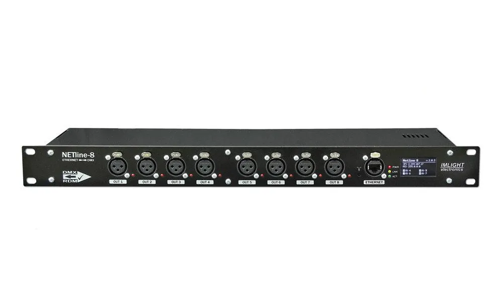 ИМЛАЙТ NETline-8-5pin (OLED) Блок преобразования сигнала ARTNET в DMX-512-A, поддержка RDM, 1 вход, 8 выходов с гальванической развязкой, индикация по входу и выходам, питание по сети 110-240В 50/60Гц, разъемы EtherCon и XLR 5-pin роз., OLED индикатор, вы