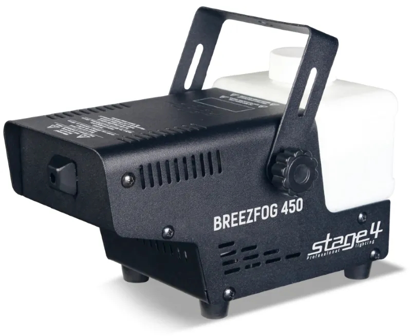 STAGE4 - BREEZFOG 450, Тип: генератор дыма, Мощность: 400 Вт, Емкость для жидкости: 0,5 литра, Управление: проводной ПДУ (3 метра), Время нагрева: 4 минуты, Производительность: 57 мᶟ/мин, Расход: 15 мл/мин, Выброс дыма: 3 метра, габариты: 230х142х140 мм,