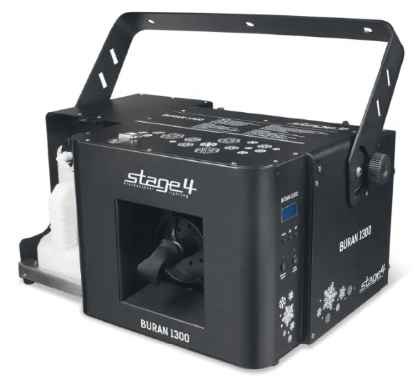 STAGE4 - BURAN 1300. Генератор сценического снега. Мощность 1300Вт, дистанция выброса - до 9м, канистра для жидкости: 5,6л, управление: DMX-512, панель на корпусе (таймер с пресетами), опциональный проводной ПДУ VT-1 (00-27689), расход жидкости: 500 мл/м