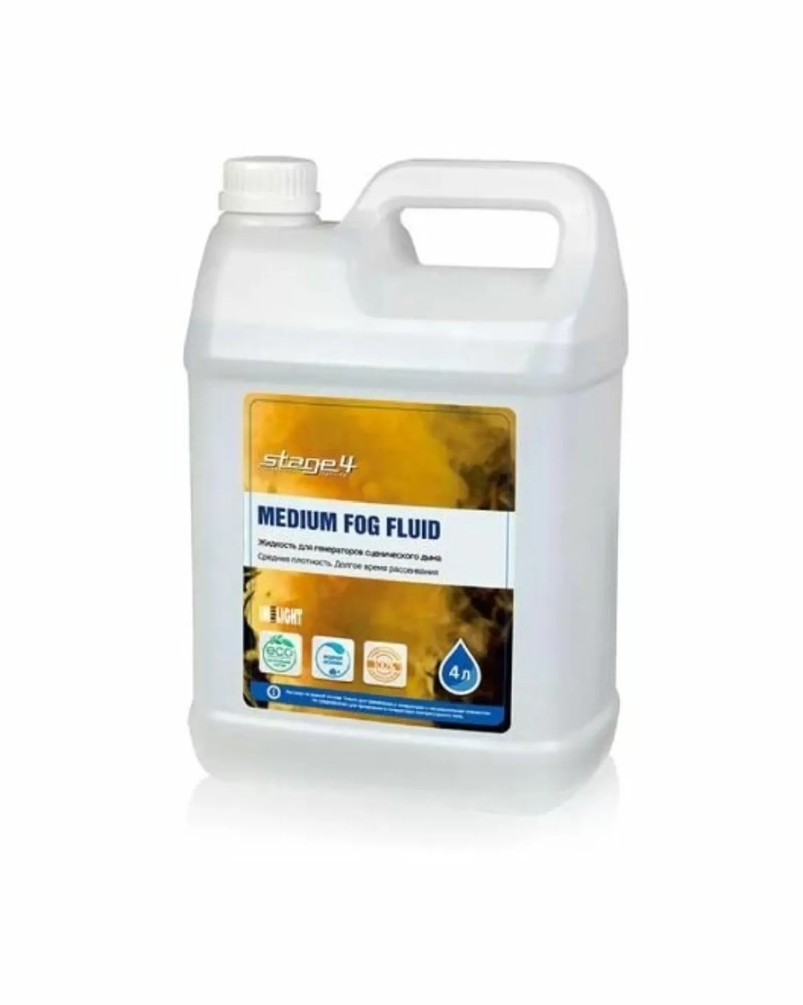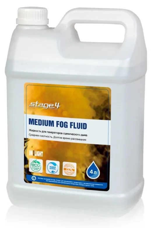 STAGE4 - MEDIUM FOG & HAZE FLUID, 4L (ex. MEDIUM FOG FLUID, 4L). Жидкоcть на водной основе для генераторов дыма и генераторов тумана. Средняя плотность и среднее время рассевания. Канистра 4 литра.