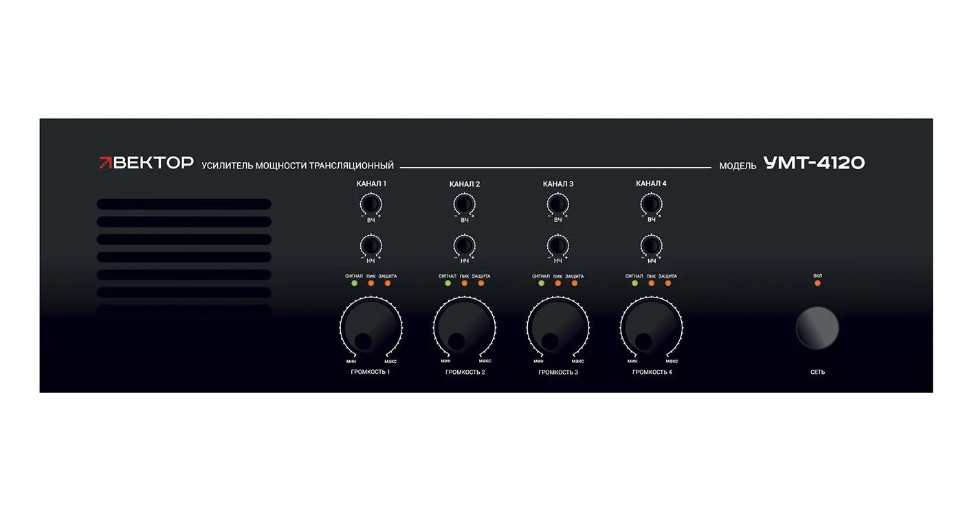 ВЕКТОР УМТ-4120 Усилитель мощности 4х120 Вт/100 В, 70 В выход или 4-16 Ом. Линейные вход /выходы, (разъем тип Phoenix). Индикация режимов работы усилителя. Регулировка уровня выходного сигнала, регулировка НЧ/ВЧ, многоступенчатая защита. Питание 220-230 В