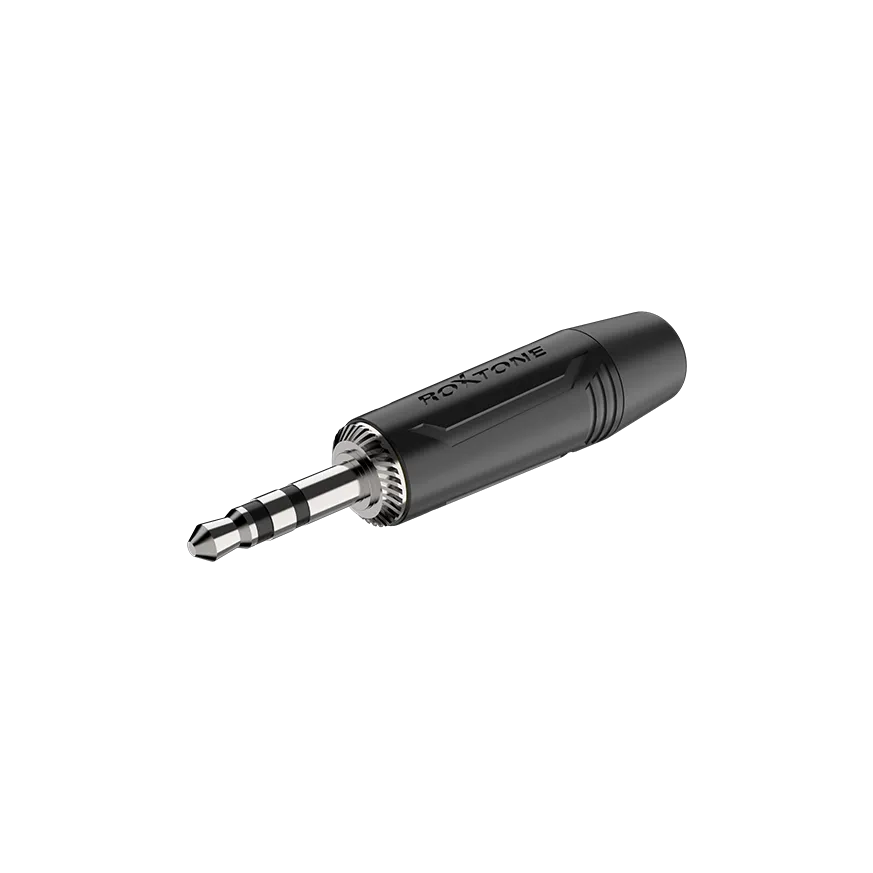 ROXTONE RMJ3P-BN Разъем Jack 3,5 RMJ3P-BN (кабель до 6мм.)мм, стерео. Корпус из цинкового сплава с резиновым держателем под кабель (до 6мм.), контакты: никелерованая бронза, цвет:черный. 1шт/PE пакет, 400шт. в мастер упаковке размером: 46x36x30см