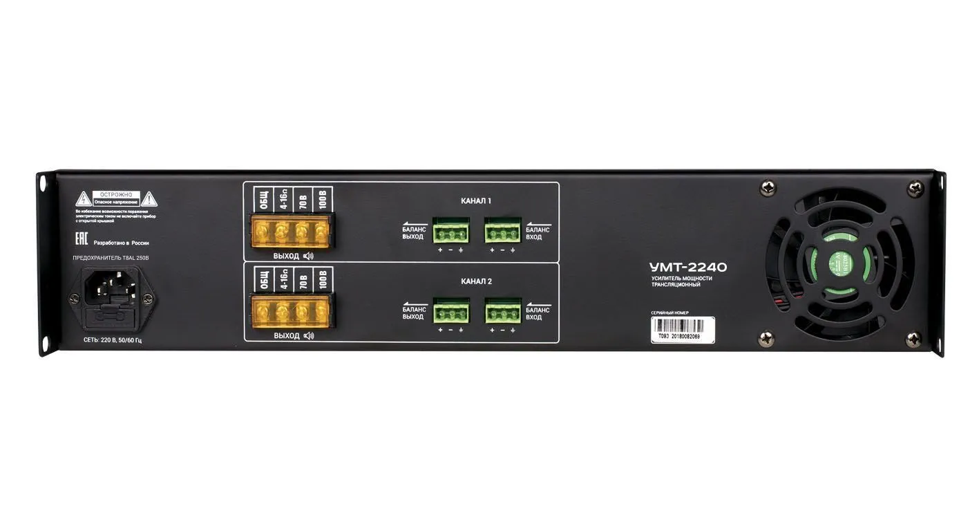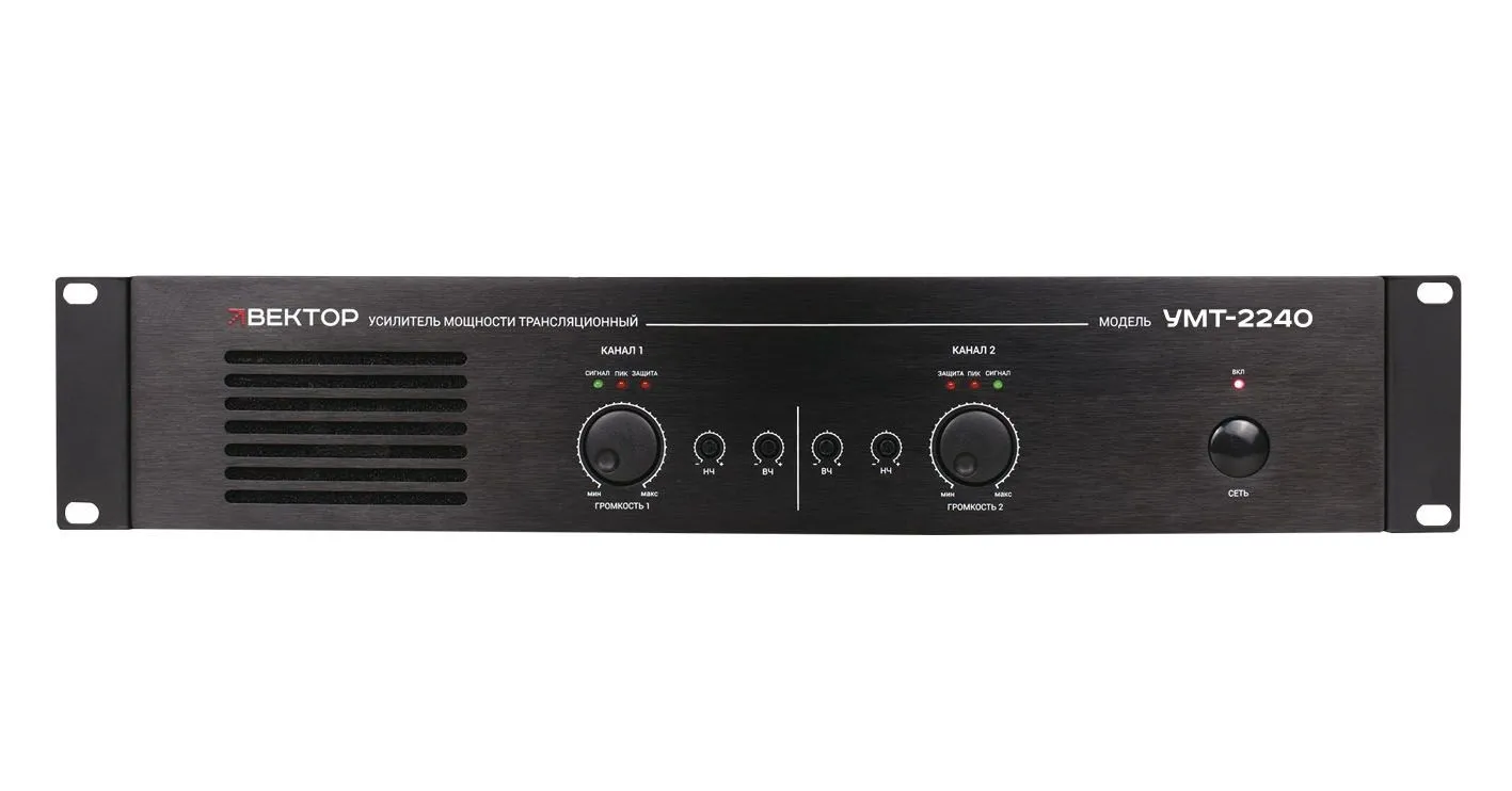 ВЕКТОР УМТ-2240 Усилитель мощности 2х240 Вт/100 В, 70 В выход или 4-16 Ом. Линейные вход /выходы, (разъем тип Phoenix). Индикация режимов работы усилителя. Регулировка уровня выходного сигнала, регулировка НЧ/ВЧ, многоступенчатая защита. Питание 220-230 В