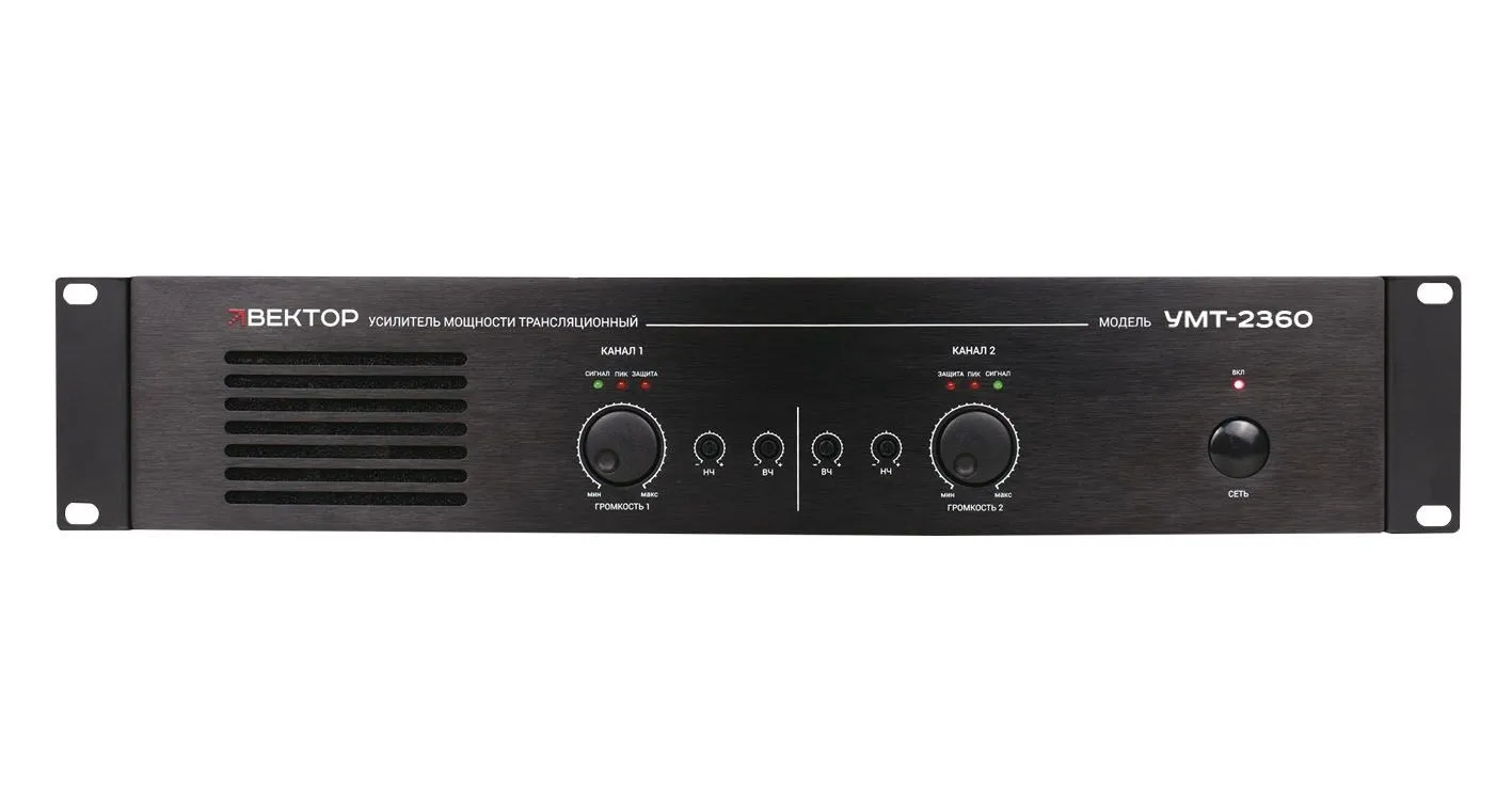 ВЕКТОР УМТ-2360 Усилитель мощности 2х360 Вт/100 В, 70 В выход или 4-16 Ом. Линейные вход /выходы, (разъем тип Phoenix). Индикация режимов работы усилителя. Регулировка уровня выходного сигнала, регулировка НЧ/ВЧ, многоступенчатая защита. Питание 220-230 В
