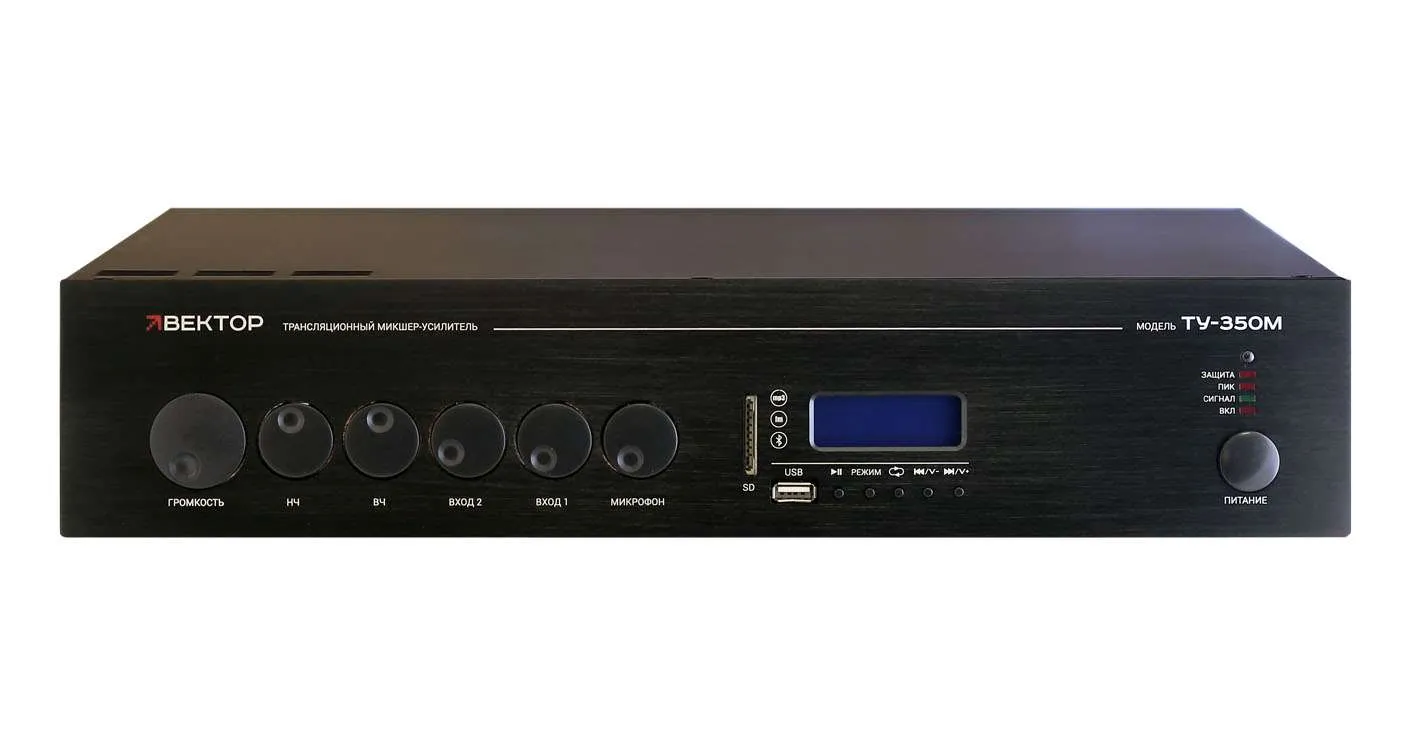 ВЕКТОР ТУ-350М Комбинированный микшер-усилитель. Мощность 350Вт. Выход 100В\4-16Ом, 1 микр и 2 AUX входа, 1 AUX выход. Цифровой FM тюнер, MP3 плеер, USB, SD, Bluetooth. Питание 220В. Рэковое крепление в комплекте.