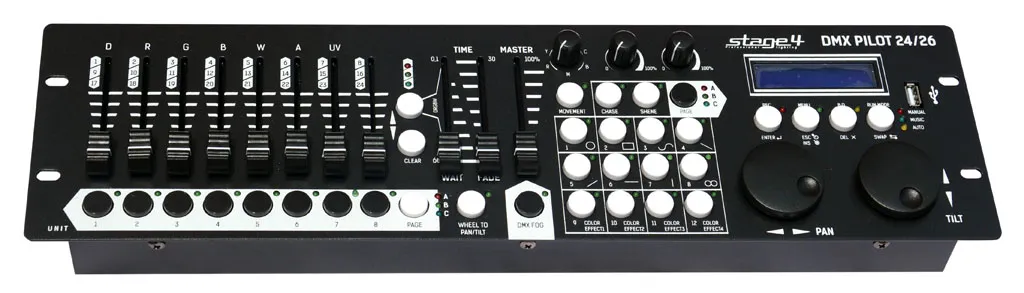STAGE4 DMX PILOT 24/26 Контроллер для управления светом. 24 прибора по 26 каналов максимум каждый.DMX512/RDM, 512 DMX каналов (SOFT PATCH), USB-порт, 2 колеса для PAN/TILT, библиотека встроенных эффектов для PAN/TILT и RGBW синтеза цвета. 482*134*70 мм.,