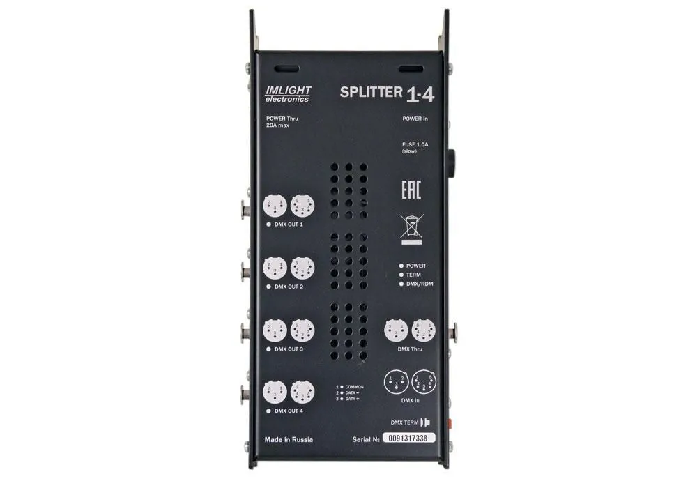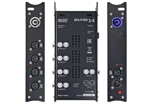 ИМЛАЙТ SPLITTER 1-4-PwC Блок усиления сигнала DMX-512-A, 1 вход, 4 выхода с гальванической развязкой, индикация по входу и выходу, встроенный терминатор, настенный крепеж, питание от сети 100-240В 50/60Гц, разъемы XLR 3-pin, сетевые разъемы PowerCon, высо