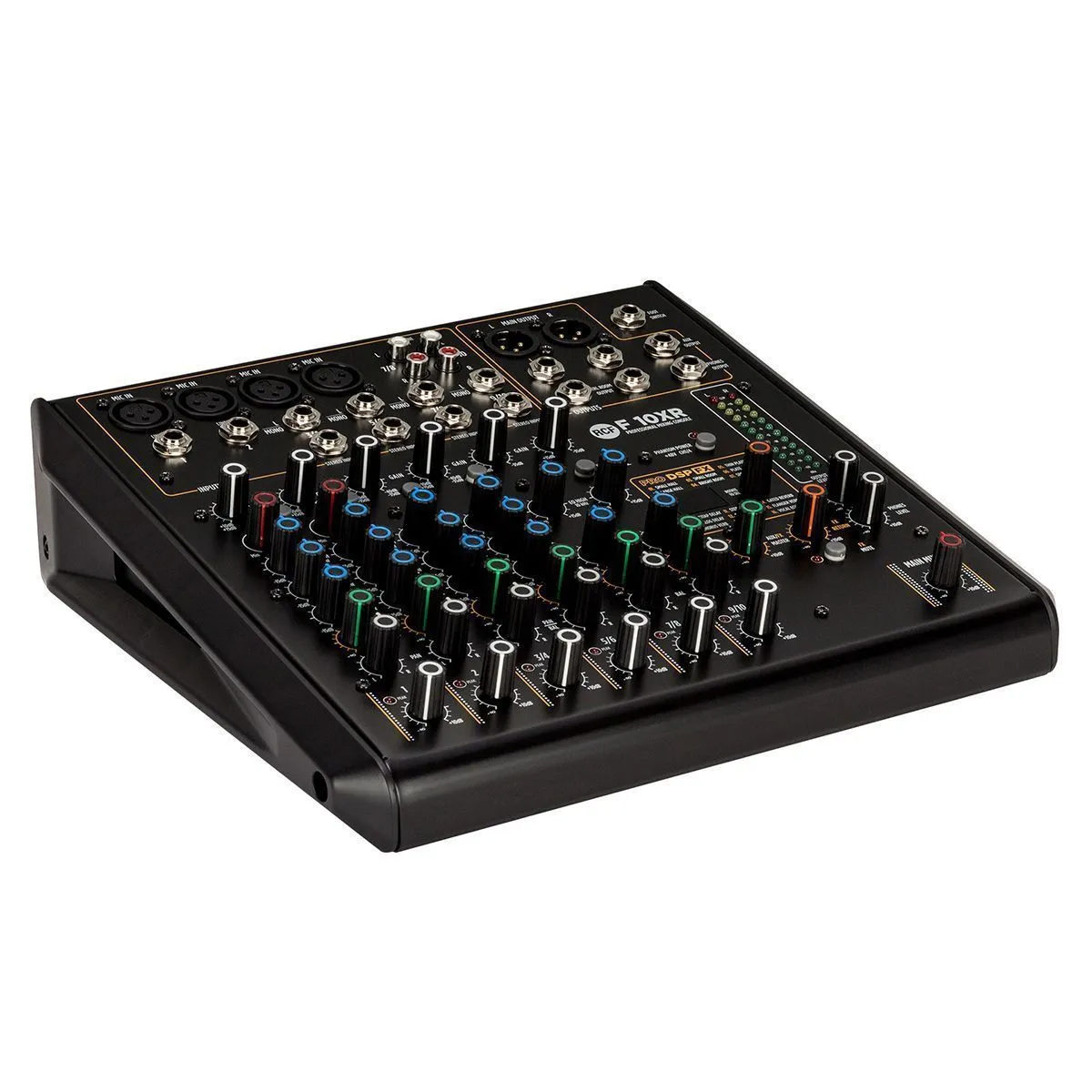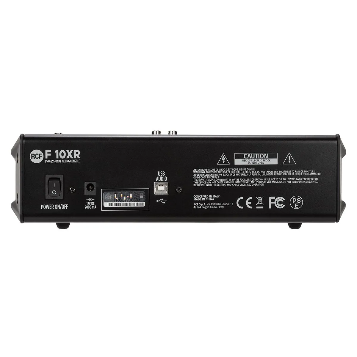 RCF F 10XRМикшерный пульт, 4 микрофонных входа, 4 стерео входа, 1 AUX/FX посыл, процессор эффектов, компрессор на 2-х микрофонных входах, 3-полосн./2-полосн. EQ, USB вход/выход, мастер выход XLR, внешний БП.