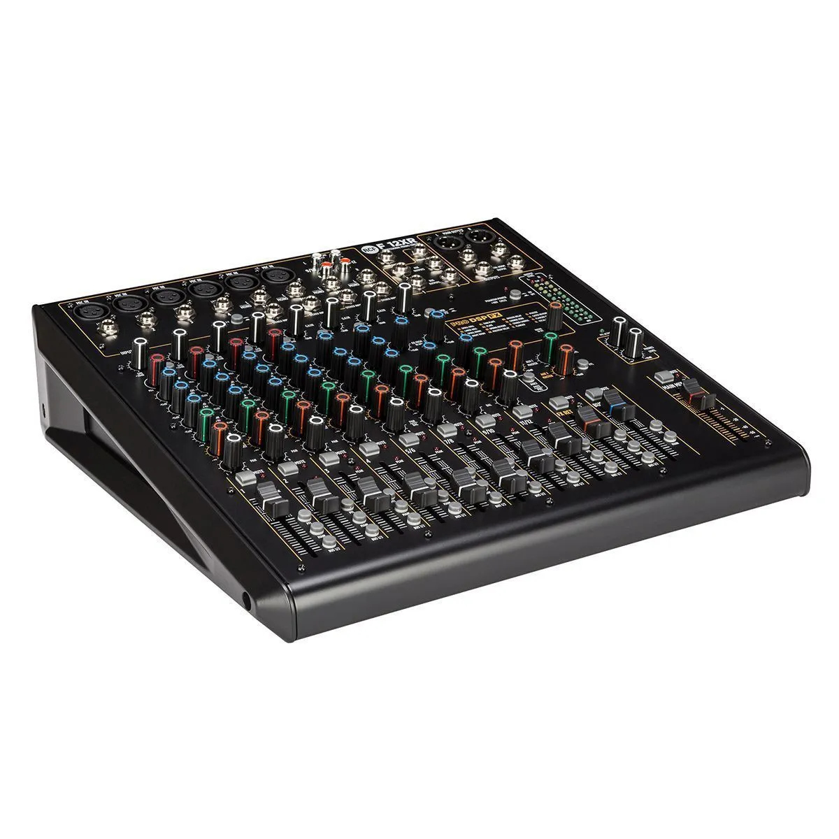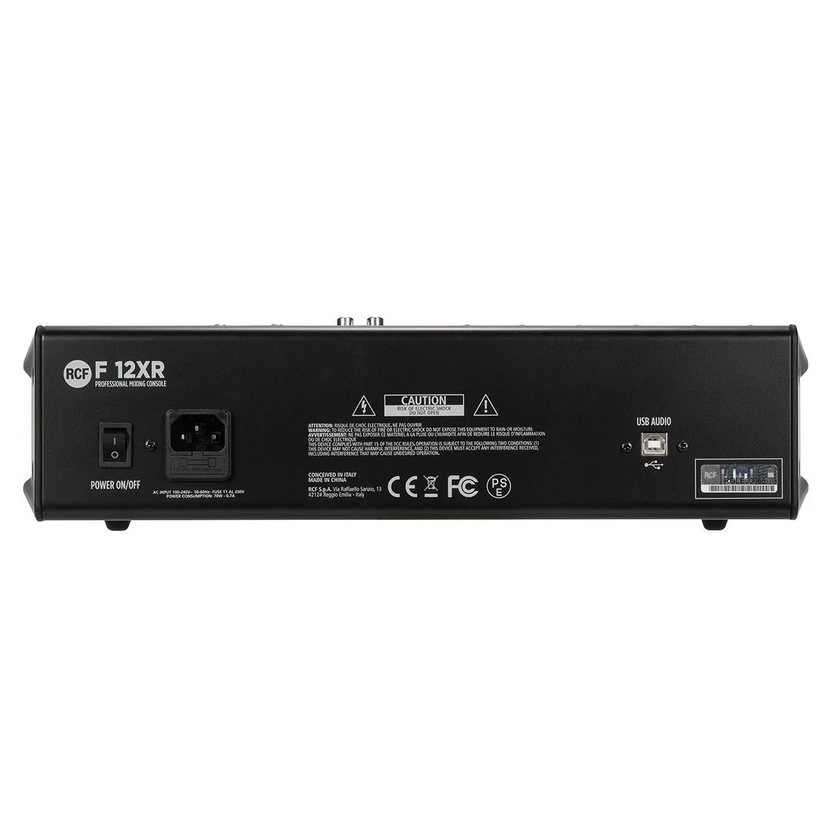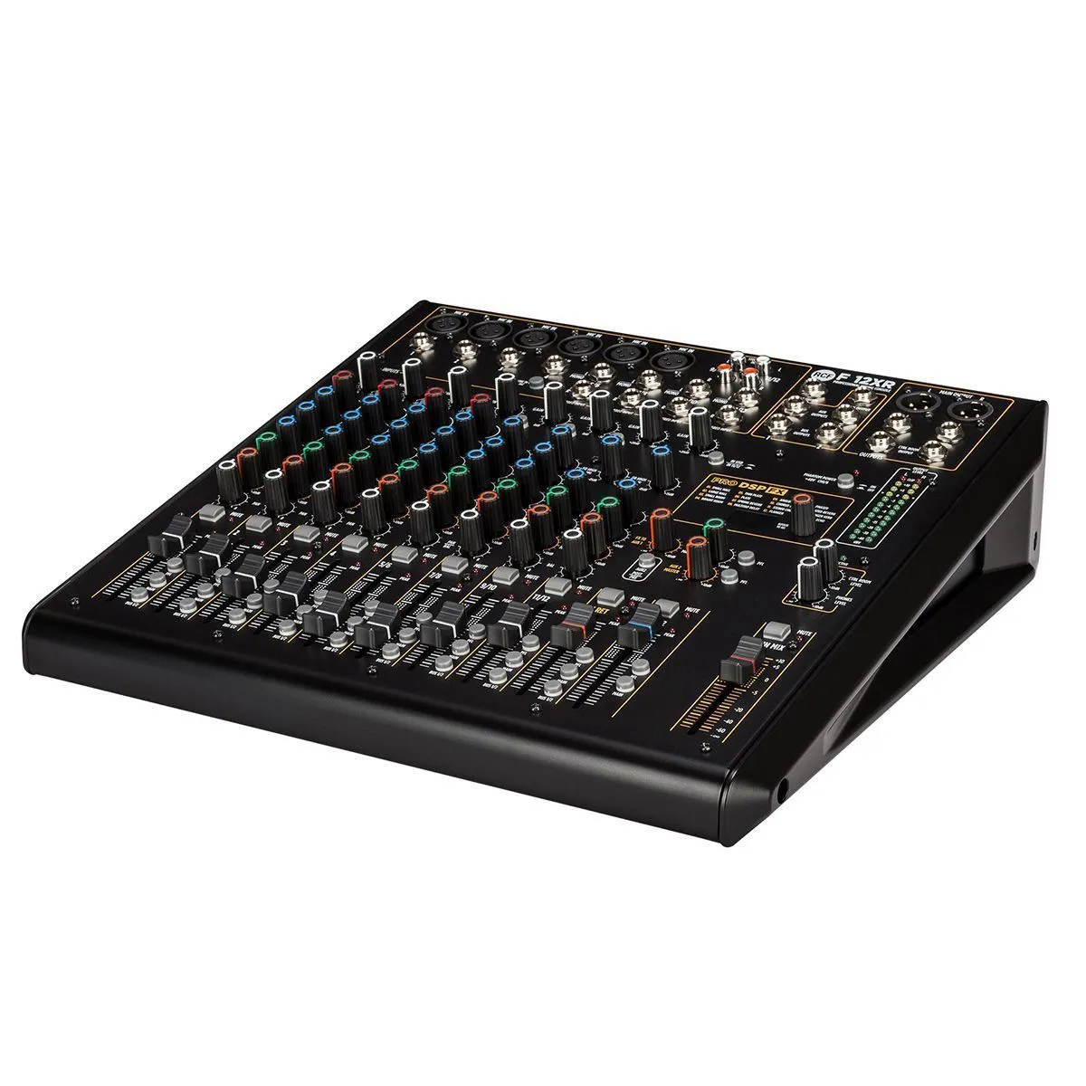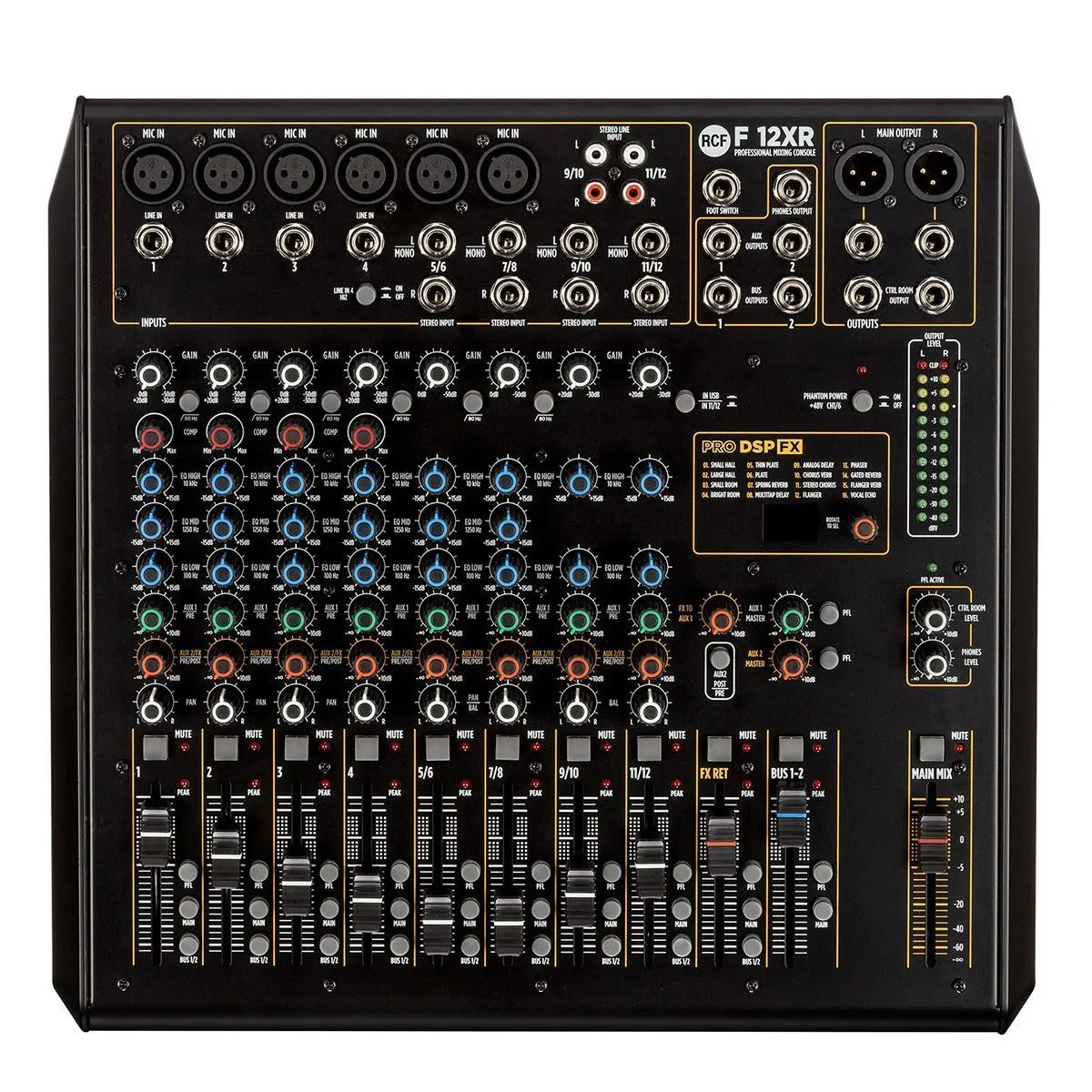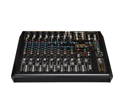 RCF F 12XRМикшерный пульт, 6 микрофонных входов, 4 стерео входа, 2 AUX/FX посылов, процессор эффектов, компрессор на 4-х микрофонных входах, 3-полосн./2-полосн. EQ, USB вход/выход, мастер выход XLR, одна подгруппа, MUTE, PFL, фэйдеры 60 мм, внутренний Б