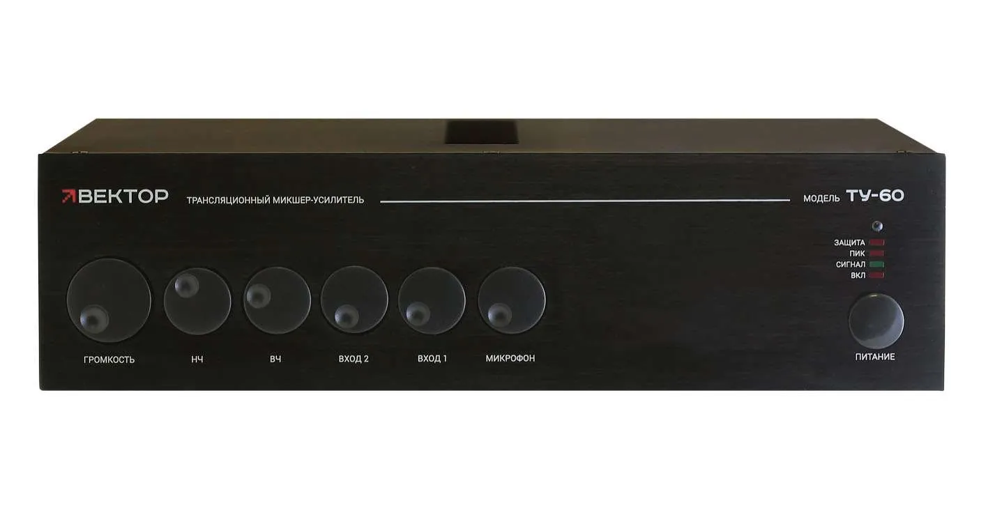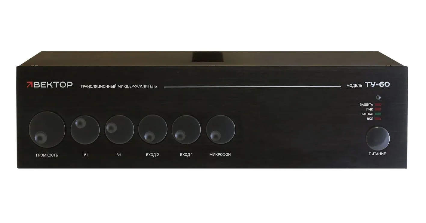 ВЕКТОР ТУ-60 Микшер-усилитель. Мощность 60Вт. Выход 100В\4-16Ом, 1 микр и 2 AUX входа, 1 AUX выход. Питание 220В. Рэковое крепление в комплекте.