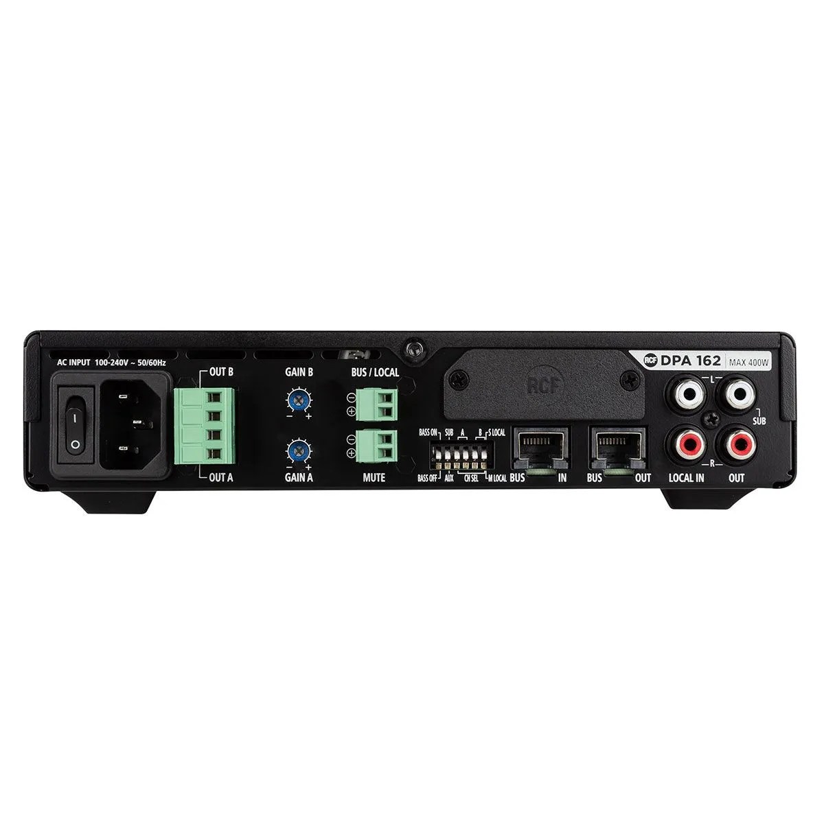 DMA 162P — это двухканальный усилитель мощности класса D. Он входит в линейку RCF BM (Business Music) вместе с микшерами-усилителями DMA 82 / DMA 162, пейджинговыми микрофонами BM 404, настенными панелями дистанционного управления RC 401. RCF DMA 162P совместим с инсталляционными акустическими системами и потолочными/корпусными громкоговорителями RCF. DMA 162P обеспечивает два канала усиления по 160 Вт RMS при низкоомном подключении (4 Ома) либо один канал 320 Вт при подключении по линии 70 В. DMA 162P можно использовать в качестве автономного усилителя, а также совместно с микшерами-усилителями DMA 82 / DMA 162 для создания распределенной звуковой системы. К одному устройству DMA 82 / DMA 162 можно последовательно подключить до 4 усилителей DMA 162P для увеличения выходной мощности системы. Усилители DMA компактны, они подходят для настольной установки или установки в рэк (½ RU). Для установки в рэк нужно приобрести опциональный набор креплений RM-KIT DMA-DPA. Благодаря своей конструкции усилители имеют уровень защиты IP 30 и высокую эффективность рассеивания тепла.