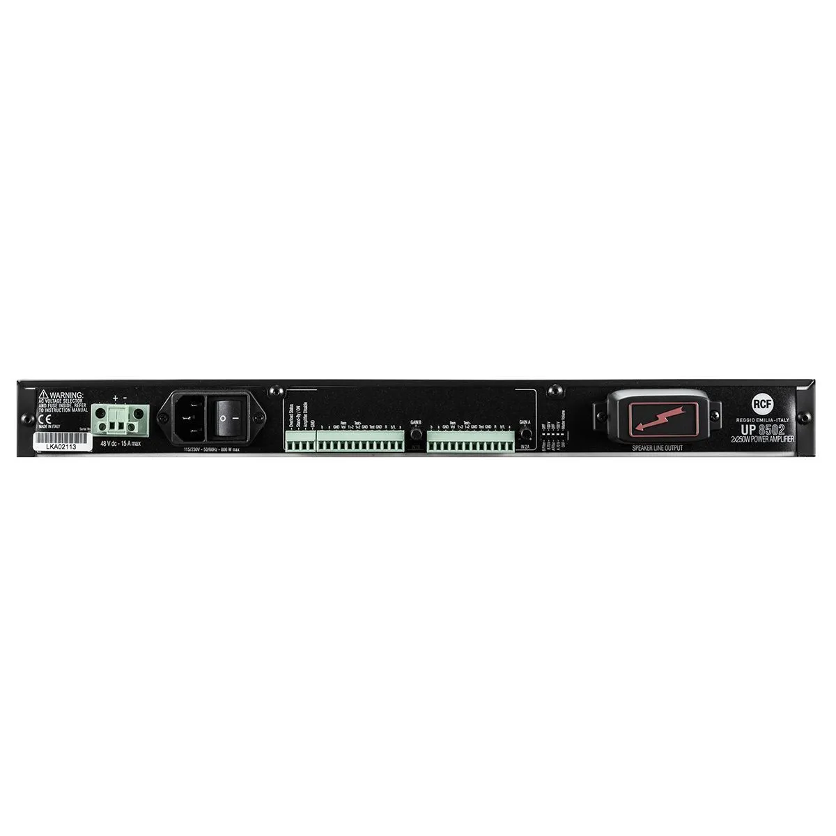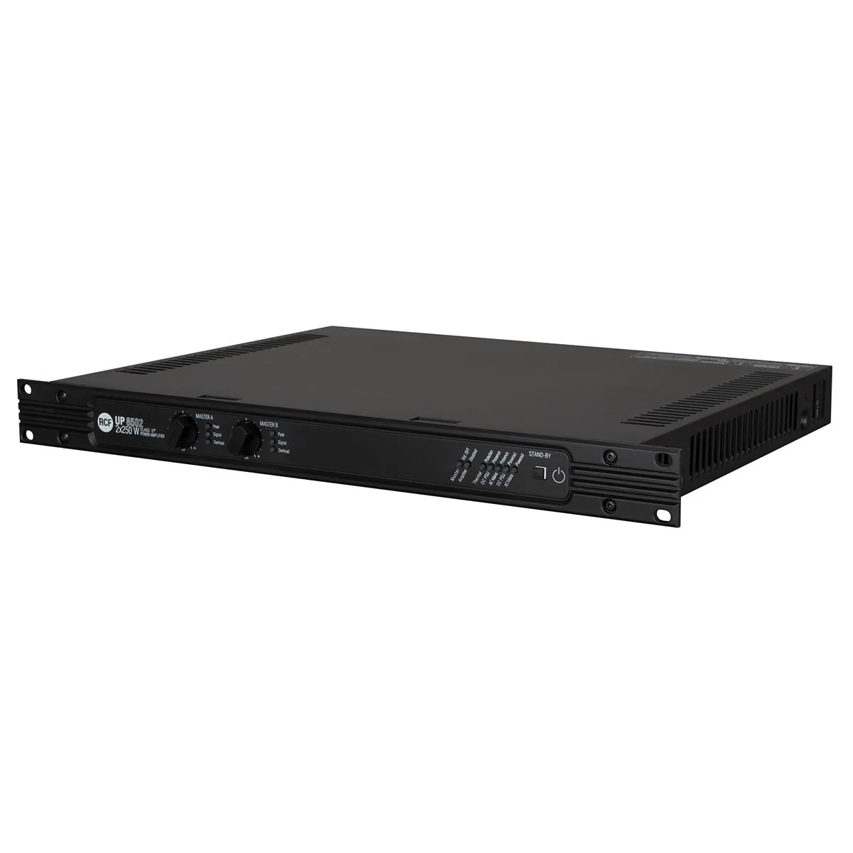 UP 8502 — двухканальный усилитель мощности класса D. Импульсные источники питания имеют независимую секцию постоянного тока 48 В. Каждый канал снабжен двумя входами и выделенной приоритетной цепью для получения микса / мьютирования и приоритетного режима. Усилители подходят для применений 70/100 В благодаря собственной технологии RCF, которая позволяет исключить линейный выходной трансформатор. Несколько индикаторов состояния на передней панели обеспечивают полную информацию о состоянии усилителя, а DIP-переключатель на задней панели позволяет отключать фронтальные регуляторы громкости во избежание неправильных действий персонала на площадке. Все разъемы являются съемными винтовыми клеммами.