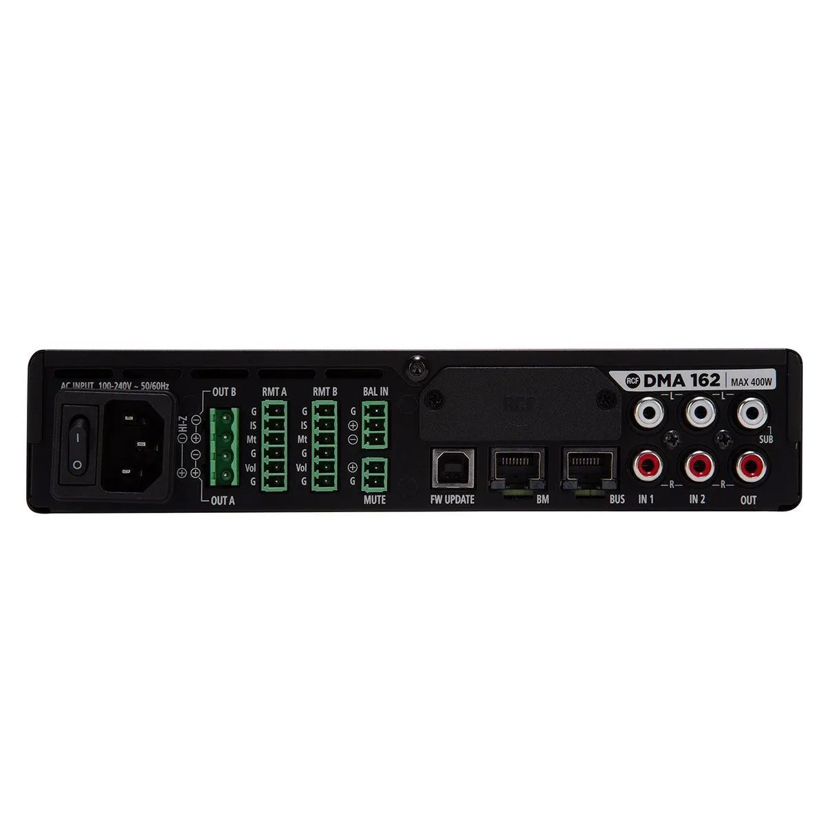 RCF DMA 162 — это двухканальный микшер-усилитель D-класса. DMA 162 оснащен DSP платформой, обеспечивающей функции маршрутизации и обработки. Доступны такие обработки сигнала, как параметрический эквалайзер, FIR-фильтры, усиление низких частот, лимитеры и компрессоры.