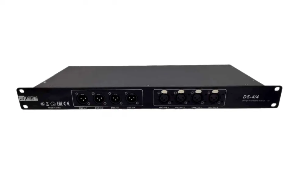 DS-4/4 Сплиттер DS-4/4 Сплиттер цифрового сигнала DMX512 4 вход, 4 выходов. Вес 2,5 кг. Габариты 482 X 170 X 44мм