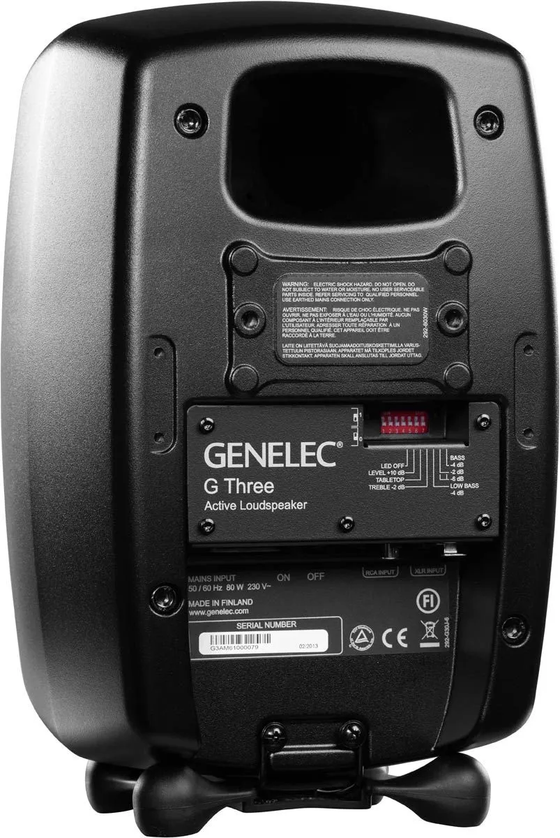 При подаче питания на передней панели АС загорается светодиод. Включатель питания находится на тыльной стороне корпуса. Там же размещены два входа – RCA и балансный XLR, рядом с которыми установлен разъем для сетевого кабеля. Активный монитор можно настроить в соответствии с акустическими особенностями конкретного помещения. Для этих целей разработчики оснастили модель набором dip-переключателей, среди которых присутствуют ступенчатые регуляторы тембров НЧ (- 2, - 4 ,- 6 дБ) и ВЧ (- 2 дБ), «ползунок», повышающий уровень громкости на 10 дБ, а также выключатель расположенного на фасаде LED-индикатора. Имеется настройка Low Bass (- 4 дБ), которая уменьшает чрезмерное усиление баса в нижней области НЧ. Есть dip-регулятор Tabletop, предназначенный для смягчения эффекта доминирования баса при расположении колонки на столе.Акустика Genelec G Three отличается точным нейтральным звучанием, характерным для мониторов ближнего поля действия. Такие компактные колонки способны построить полноценную трехмерную сцену с правильным расположением образов в пространстве. Бас в их исполнении хорошо прорисован и достаточно глубок.