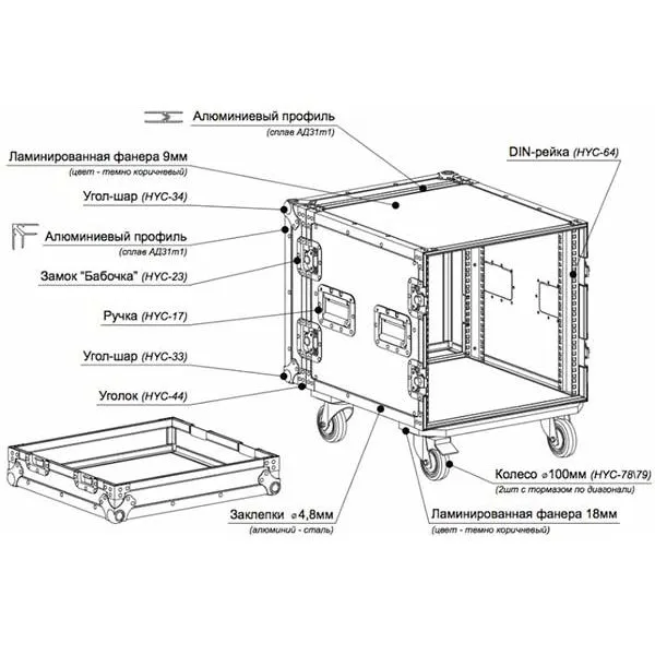 ИМЛАЙТ RCC9-480-12U Рэковый кейс 12U, глубина 480мм, DIN рейка с 2-х сторон, ламинированная фанера 9мм, с колесами d100мм, 2-а колеса с тормозом