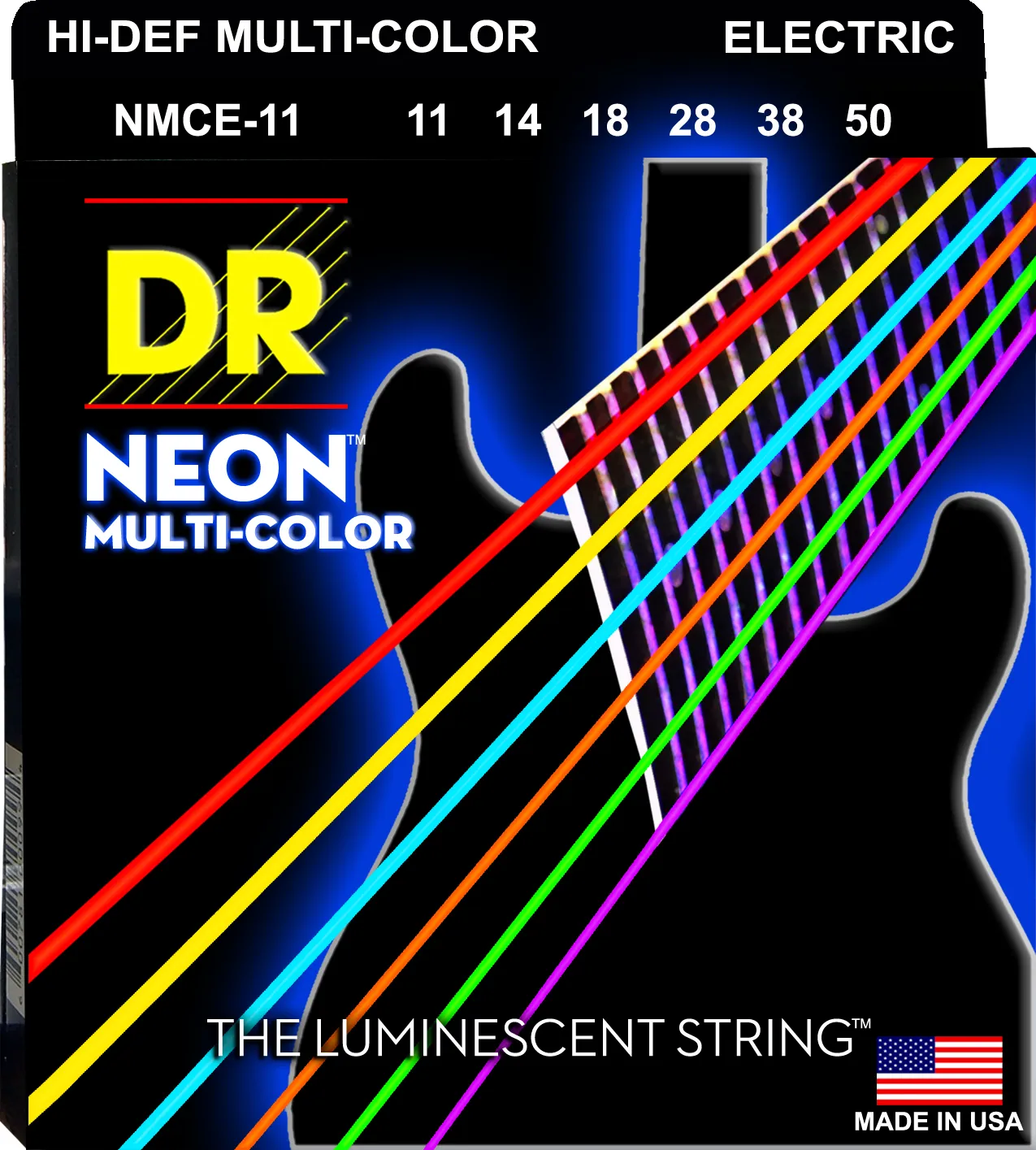 DR NMCE-11 - струны для электрогитары, Калибр: 11-50, Серия: HI-DEF NEON™, Обмотка: посеребрёная/никелированая сталь, Покрытие: люминесцентное