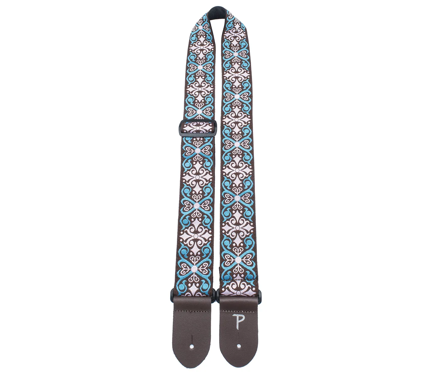 Perri's TWS-7067 - Ремень для гитары, Серия JACQUARD, Материал: жаккард, с кожаными концами, Рисунок: геометрические цветы, Цвет: синий/коричневый, Ши