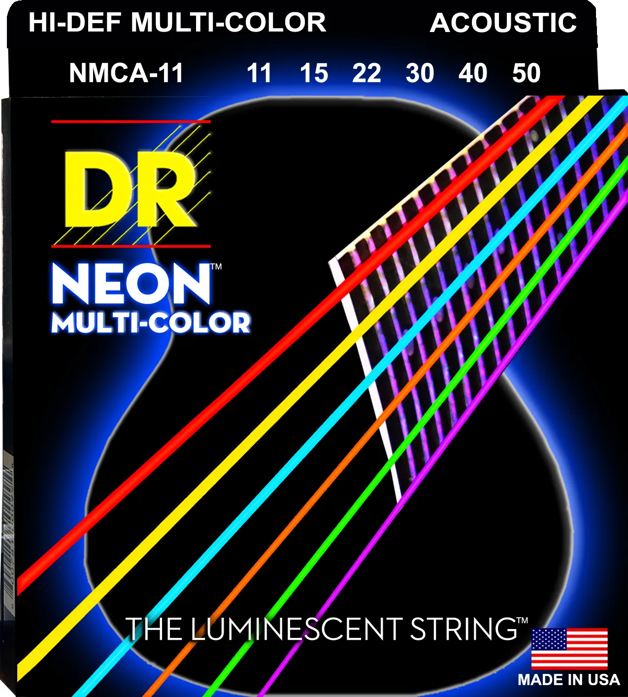 DR NMCA-11 - струны для акустической гитары, Калибр: 11-50, Серия: HI-DEF NEON™, Обмотка: посеребрёная медь, Покрытие: люминесцентное