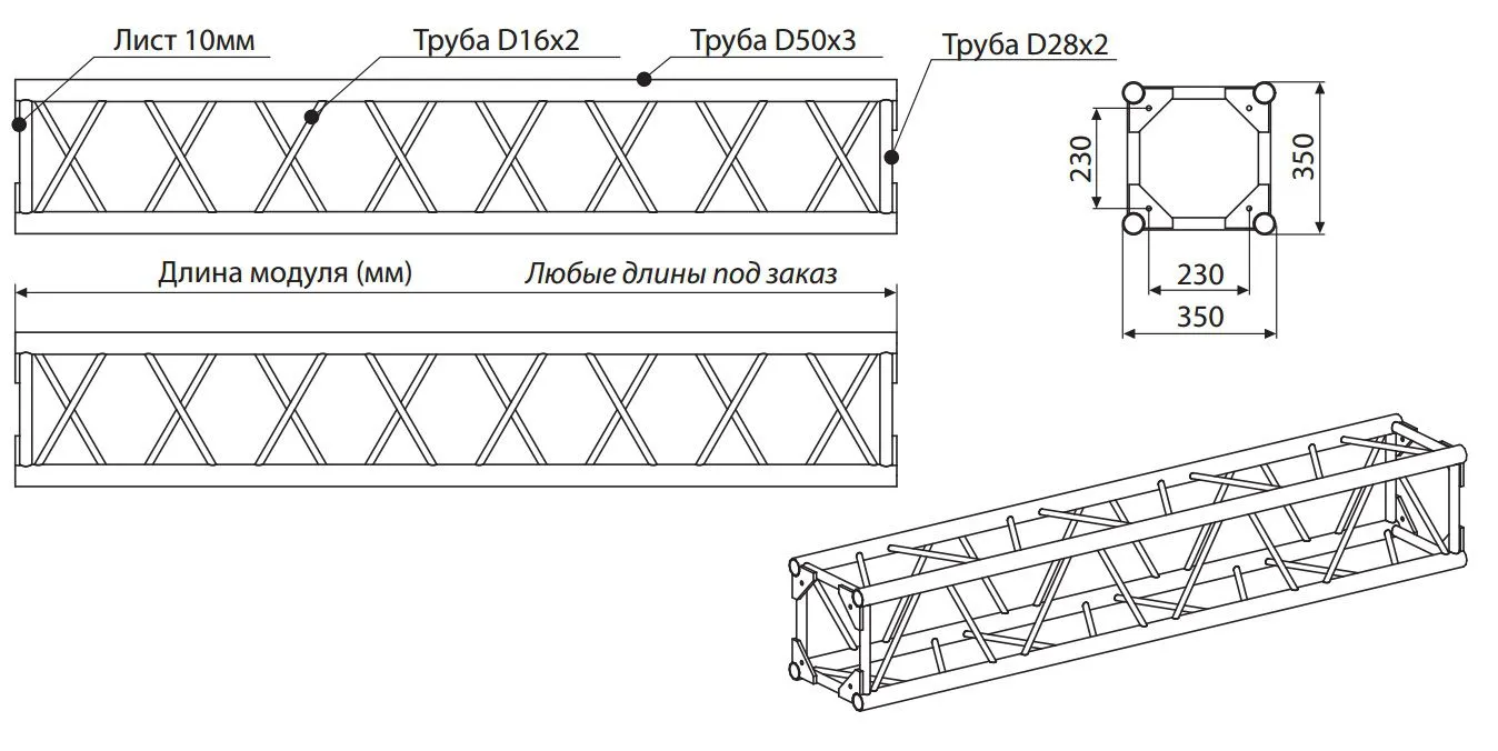 ИМЛАЙТ Q2-F(75)-3000 (Roof) Прямой модуль квадратной конфигурации длиной 3000мм, 350x350мм, d50x3 \ d16x2мм. Крепежный размер 230х230мм, М10. Рисунок перемычек круговой.