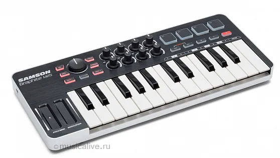 Graphite M25 Mini USB/MIDI клавиатура, 25 чувствит-х к скорости нажатия клавиш, 4 триггерных пэда, назначаемые энкодеры и кнопки. Совместим с iPad/PC/Mac. вес 0,65 кг. SAMSON