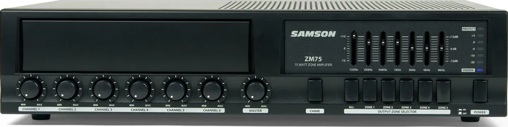 ZM75 зонный микшер-усилитель 6 входов (4 микрофонных, 2 линейных), 5 зон, 75 Вт/4 ом или 100вольт, 7 полос графический эквалайзер, опция модуль источник муз.программ TCM-3, 420х343х88 мм, вес 9,8 кг