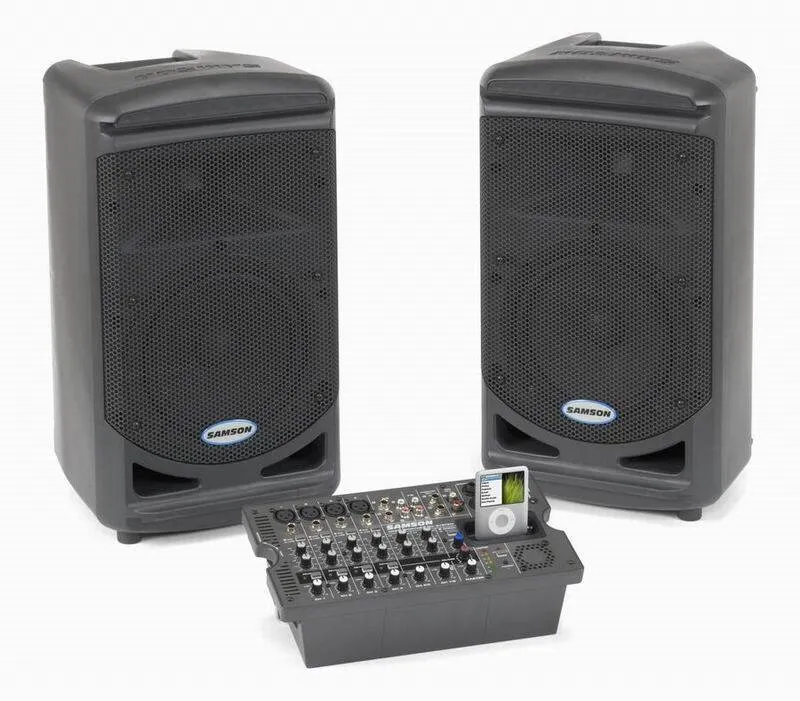 XP308i Мобильный звуковой комплект: Две акустич. системы 2х150 Вт (8"НЧ+1"ВЧ) 90°х60°, встр. 8-ми канальн. микшер-усилитель 300 Вт с процессором эффектов, док-станция для iPod, соед. Кабели. SAMSON