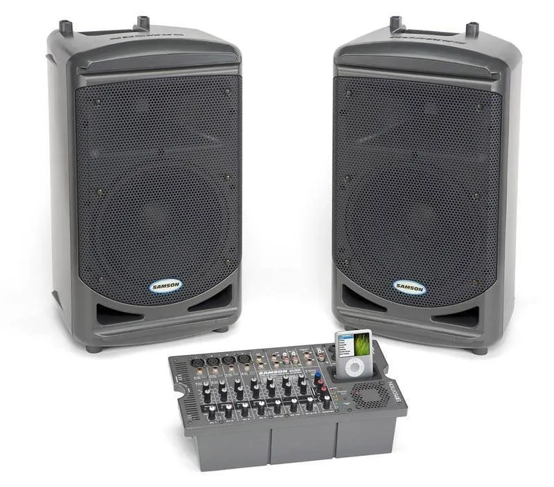 XP510i Мобильный звуковой комплект: 2 акустич. сист 2х250 Вт (10"НЧ+1"ВЧ) 90°х60°, встр. 10-ти канальн. микшер-усил-ль 500 Вт с процессором эффектов 24-bit, док-станция для iPod, Кабели. SAMSON