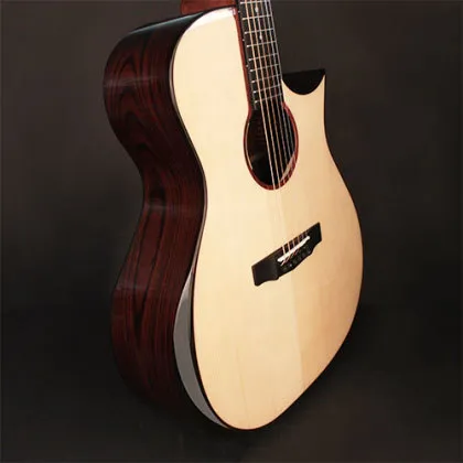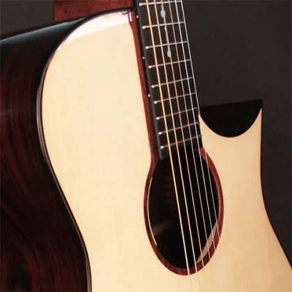 Для повышения комфорта и удобства игры были сделаны специальные конические вырезы для подлокотника и подставки для ребер. Эти вырезы не только обеспечивают эргономичную функциональность, но и придают уникальный вид, который не часто встречается на акустических гитарах высокого класса.