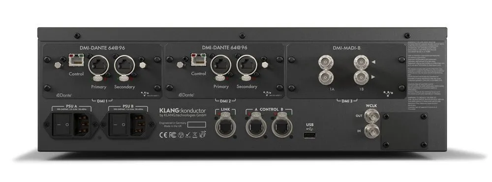 KLANG X-KG-KOND-MADI Цифровой матричный процессор для иммерсивного ушного мониторинга звуковых сигналов, 128 входных каналов, обеспечение до 16 миксов одновременно, 48/96 кГц, 3 слота для DMI-карт. В комплекте 2 двойных BNC MADI-интерфейса MOD-DMI-MADI-B