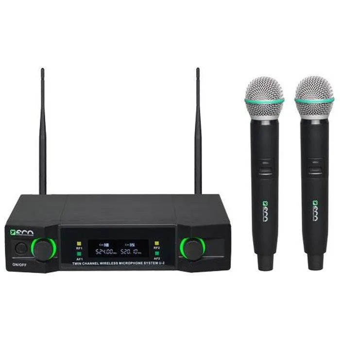 ECO by VOLTA U-2 (520.10/725.80) Микрофонная радиосистема начального уровня с двумя ручными динамическими микрофонами UHF диапазона с фиксированной частотой. True Diversity, Plug&play., 1pcs in box: 423x337x70 mm, 10 pcs in box: 435x370x354 mm, receiver