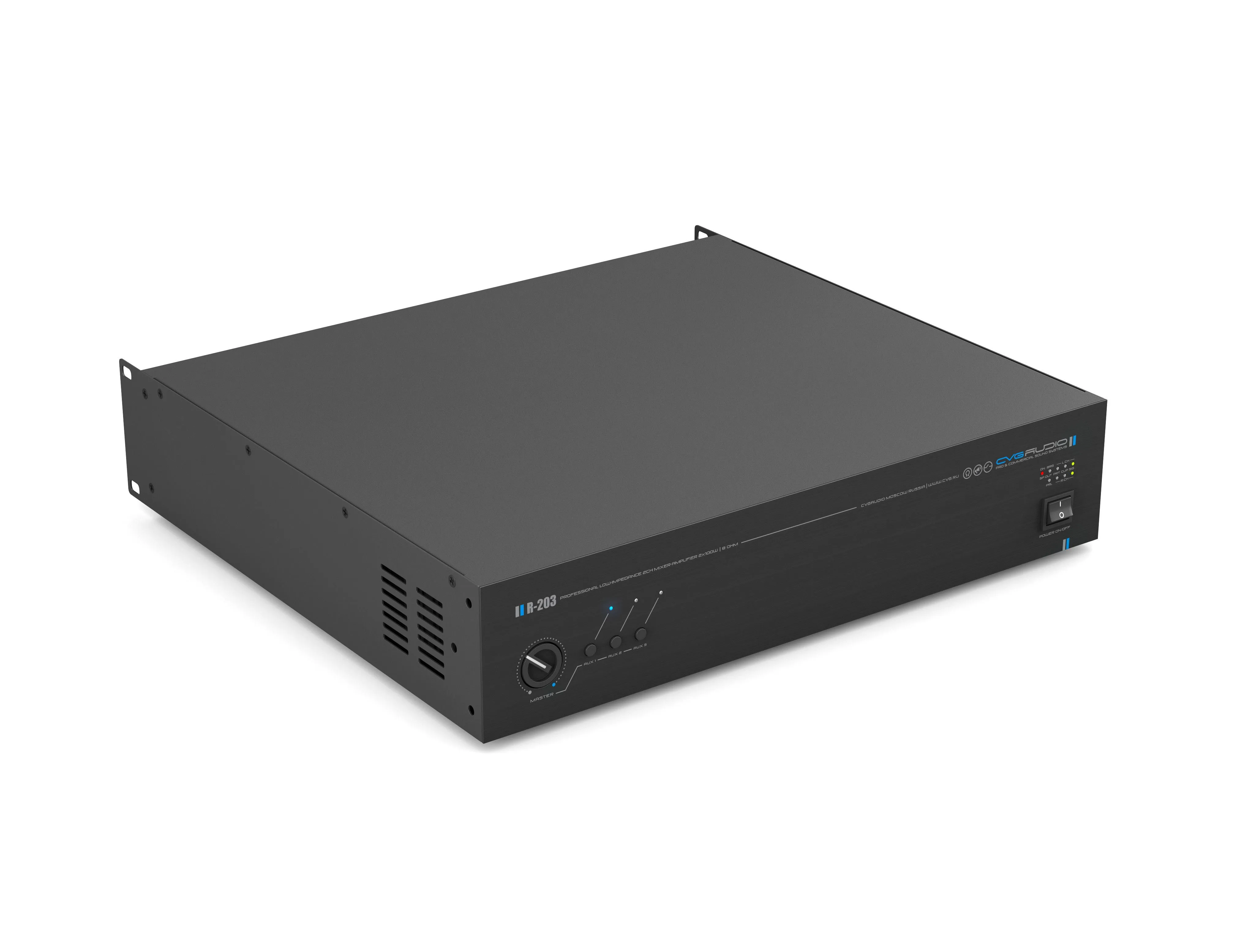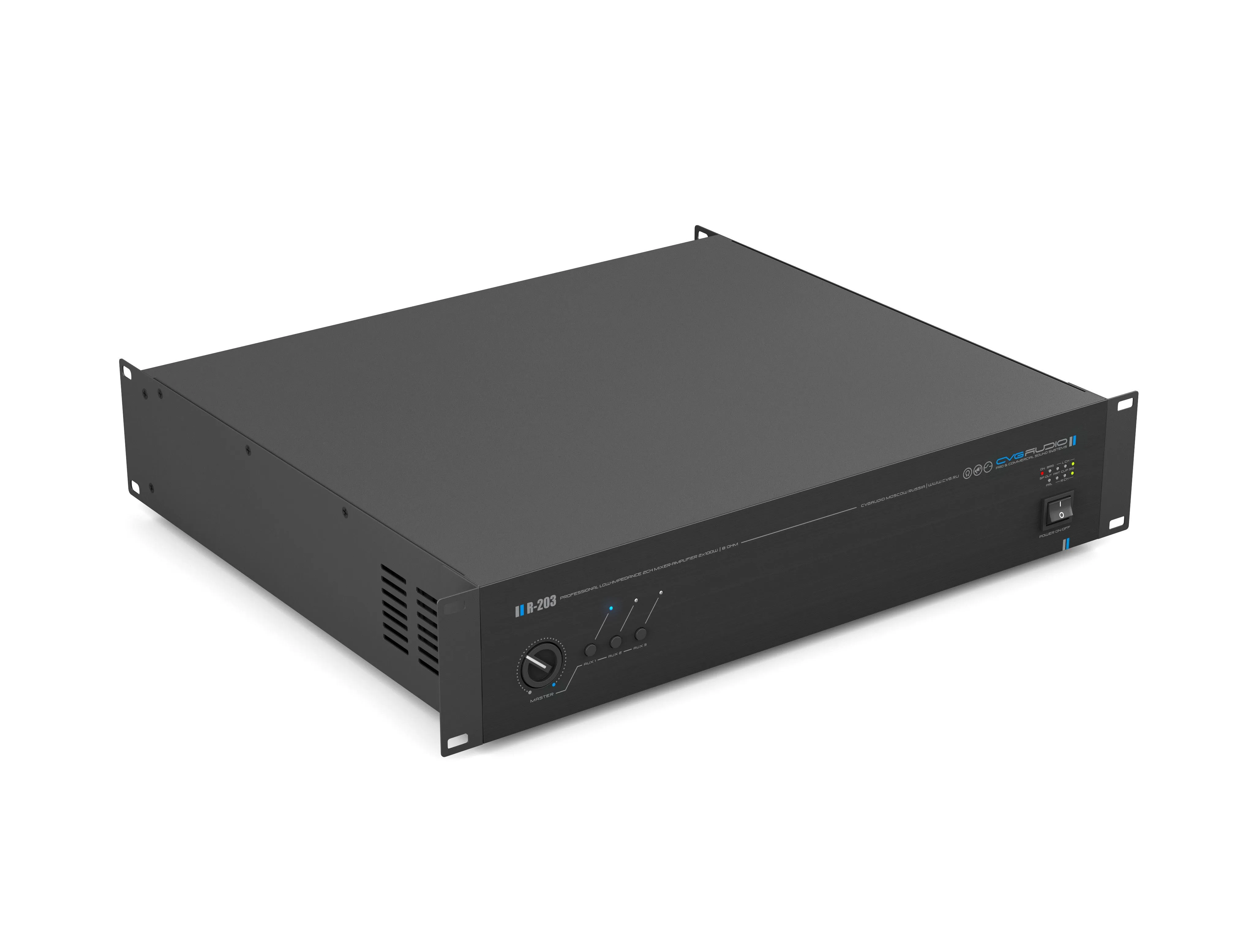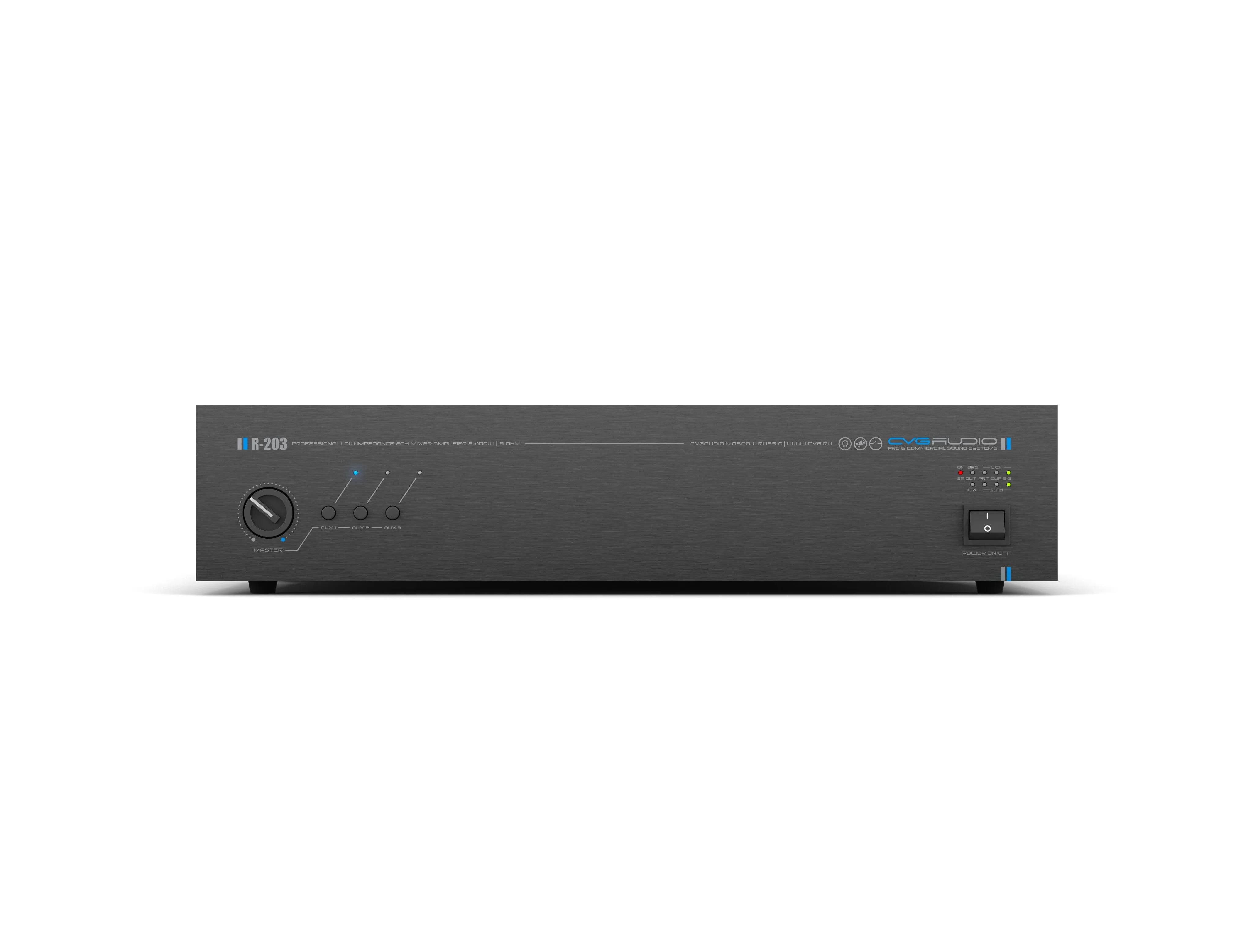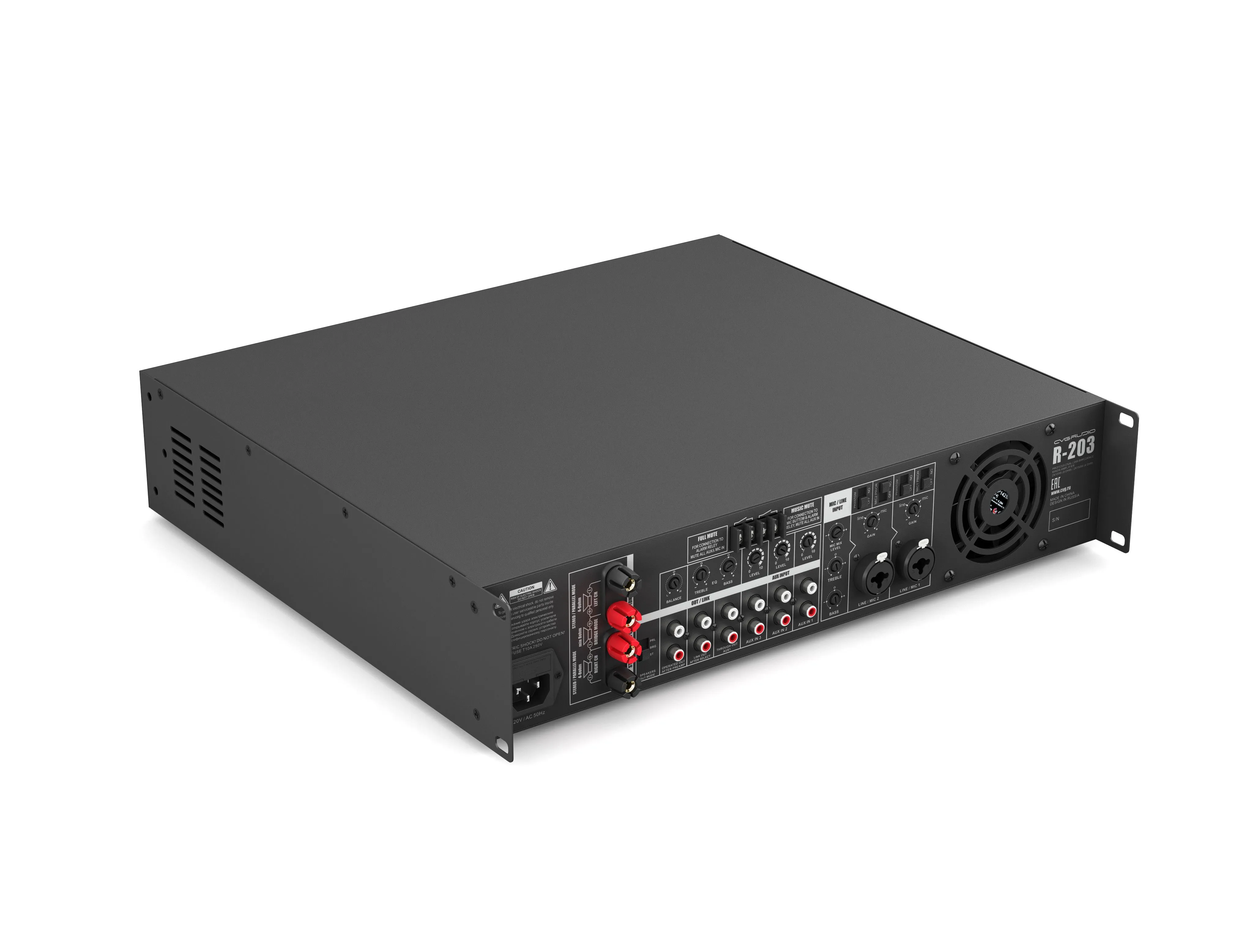 CVGAUDIO R-203 - Профессиональный 2-х канальный стереофонический микшер-усилитель, 2x100W/8ohm, 2x150W/4ohm, 4-8ohm, 3 Line input - 2RCA, 2 mic input 2xTRS/XLR, Line/Mix EQ, EXT.MUTE/ FULL MUTE, stereo/bridge/parallel