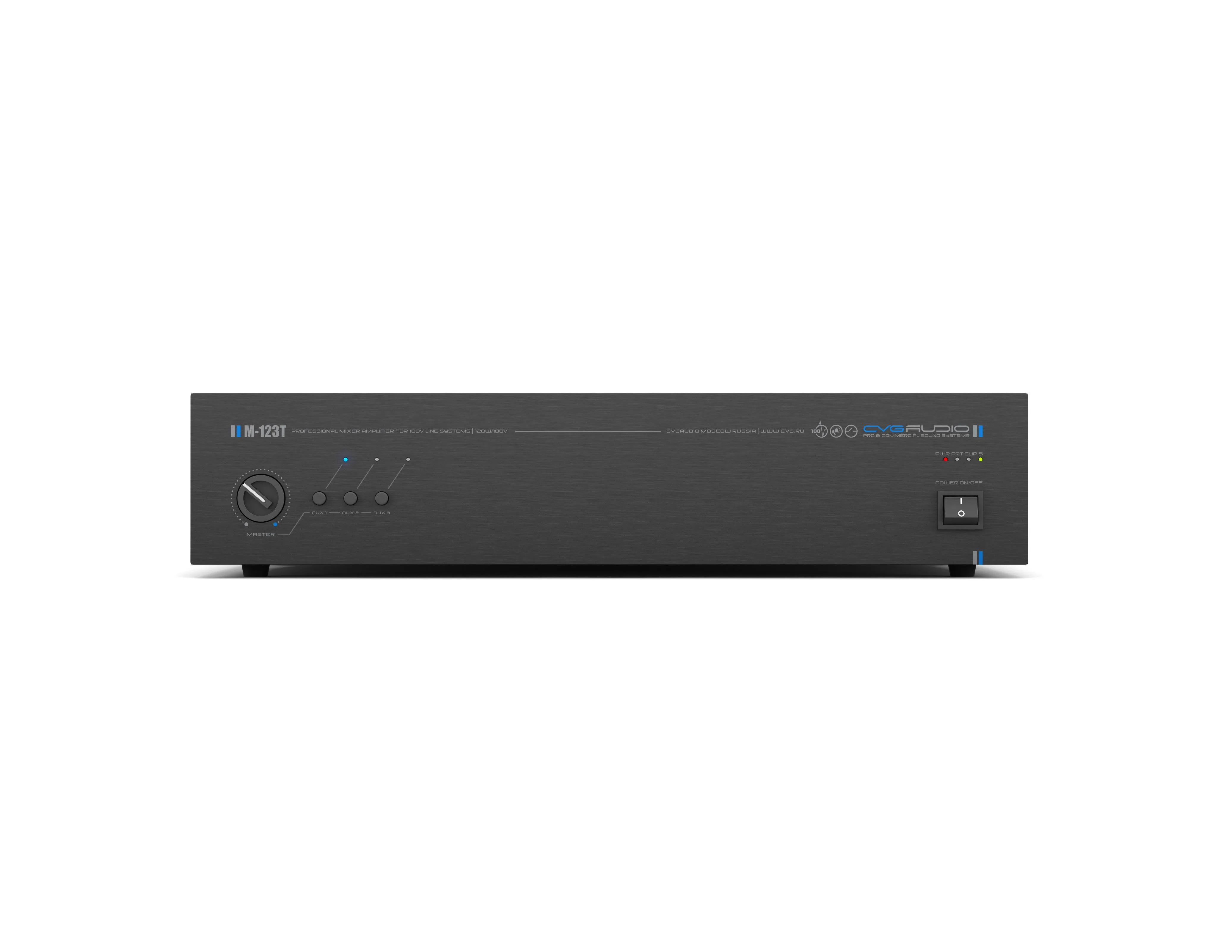 CVGAUDIO M-123T - Профессиональный микшер-усилитель для качественных систем трансляции фоновой музыки и голосового оповещения, 120W/100V, 3 line in, 2 mic/line in (настраиваемый приоритет), управляющие контакты FULL MUTE, MUSIC MUTE, раздельный EQ для лин