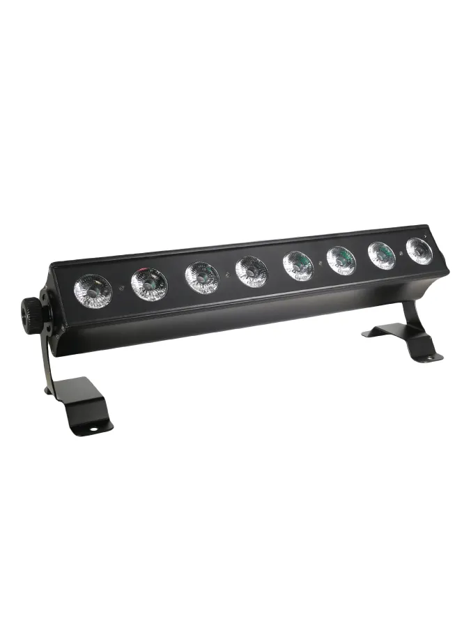 LED Bar 8-10 Прожектор LED Bar 8-10. Прожектор, 8 светодиодов 6 в 1 RGBWAUV по 10 Вт. Электронный диммер 0-100%. Строб. Угол луча 20°. Управление: DMX512 1/6/10/12/24/27), звуковая активация, автоматический режим, master/slave. Питание: AC