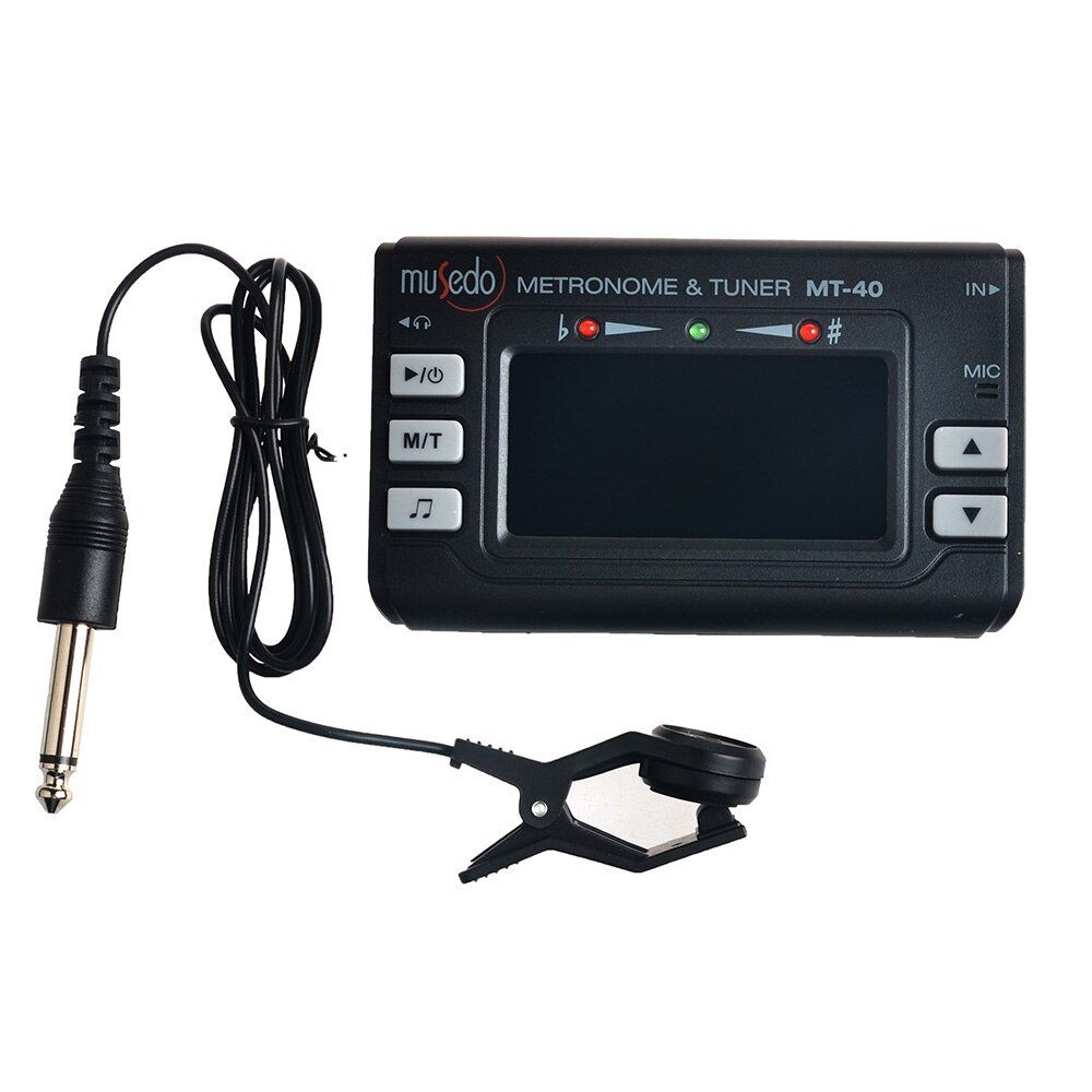 MUSEDO MT-40 (3 в 1) Метроном+Тюнер+Тон генератор. Универсальное устройство, подходит для всех типов инструментов, главным образом для гитар, бас-гитар, скрипок и укулеле. Звукосниматель - пьезо/микрофон. Разъем для наушников. В комплекте батарейки и руководство на русском языке. ХАРАКТЕРИСТИКИ: Шкала настройки: Хроматическая, гитара, бас, скрипка, укулеле Диапазон тюнера: Ля субконтроктавы (А0, 27,5 Гц) – До пятой октавы (С8, 4186 Гц) Калибровка Ля второй (А4) октавы 440 Гц: от 430 до 450 Гц Пониженный строй: Нет, b, bb, bbb, bbbb (в режимах гитара и бас) МЕТРОНОМ Размер: 1 — 8 Ритмы: 0 – 9 Темпы метронома: 30 – 250 ударов/мин ГЕНЕРАТОР ТОНА Звуковой диапазон: 2А – 6АХарактеристики