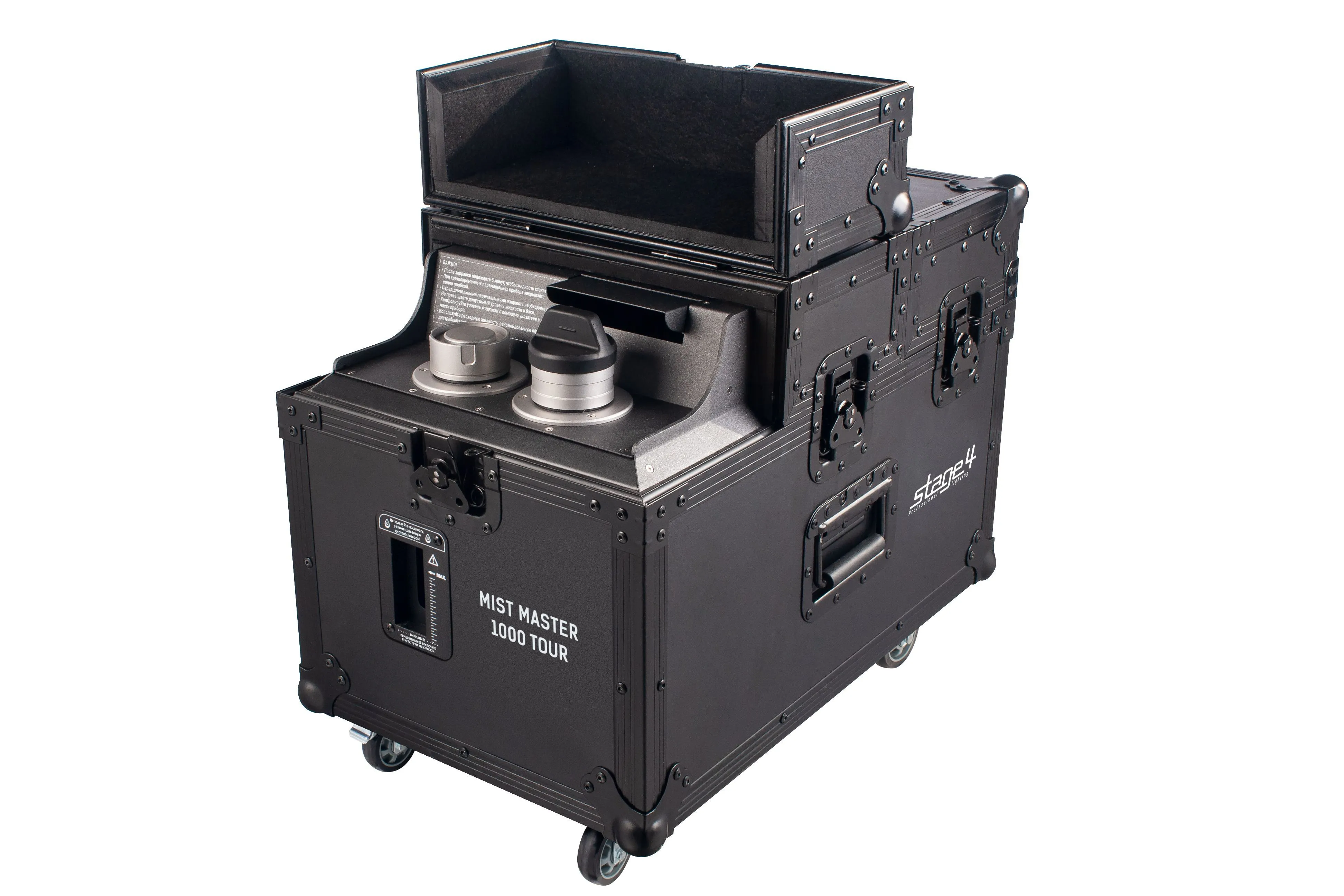 STAGE4 - MIST MASTER 1000 TOUR. Генератор тумана компрессионного типа. Потребляемая мощность 820Вт.Емкость для жидкости 2,5л. DMX512 (1/3 канала), сенсорная панель на корпусе. Таймер, регулировка мощности, интервалов и выброса тумана. Производительность 1