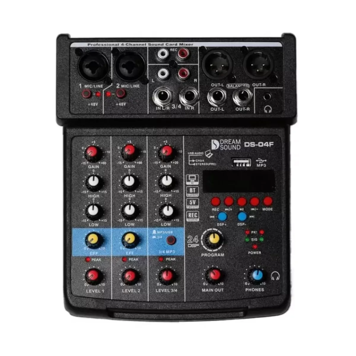 DreamSound DS-04F микшерный пульт, входы: 2 микр. /лин., 1 стерео линейный, 2х полосный EQ по каждому входу, USB МР3 плеер, Bluetooth, 16 эффектов DSP, USB для подключения к ПК как звуковой карты