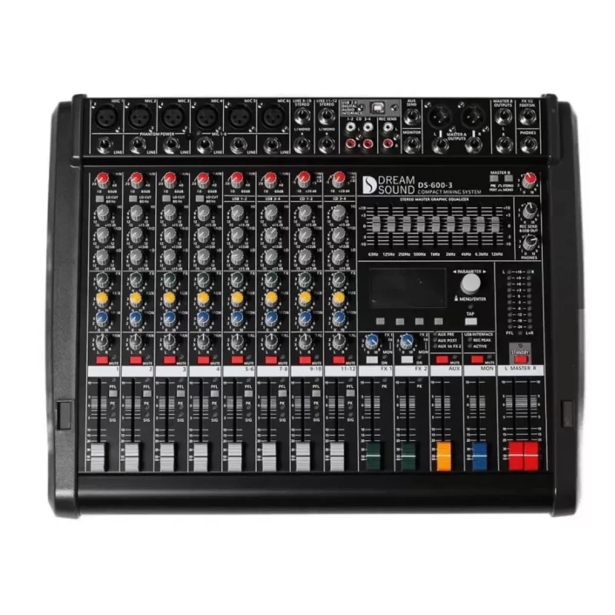 DreamSound DS-600-3 микшерный пульт, входы: 6 микрофонных/линейных + 2 стерео линейных, 1 USB, 3-х полосный эквалайзер по каждому входу, 2 DSP по 99 эффектов, 9 полосный мастер эквалайзер.