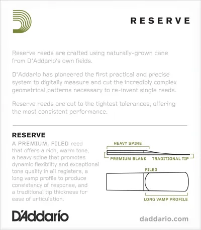 Soprano saxophone reeds D'Addario Reserve DIR0235 - Soprano saxophone reed with thicker heart and longer palette with strength 3.5. Price for two pieces
