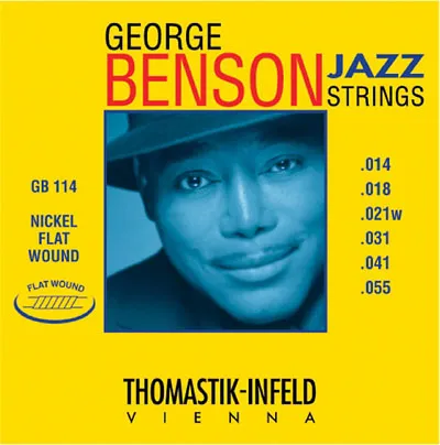 Electric guitar string set Thomastik George Benson GB114 - Jazz archtop guitar strings with flat nickel wound basses and steel trebles named after George Benson, thickness .014-.055 inch