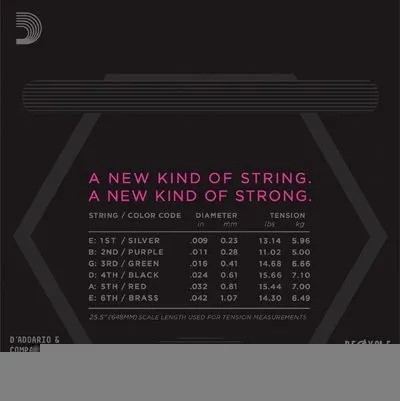 - Струна ре/4 толщиной .024 дюйма (.61 мм) натяжением 15.66 фунта (7.10 кг) с черной обмоткой на конце