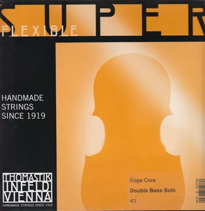 Double bass string set Thomastik Superflexible 43 - Chrome wound twisted steel strings with improved flexibility and stable tune for 4/4 double bass with solo tuning, medium tension.